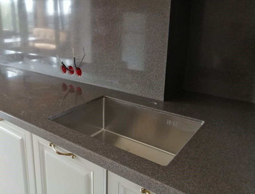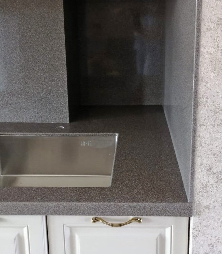 Столешница изготовлена из акрилового камня от производителя Staron, модель SM453 в темно-коричневом цвете с вкраплениями. Размер 3220х600 мм.