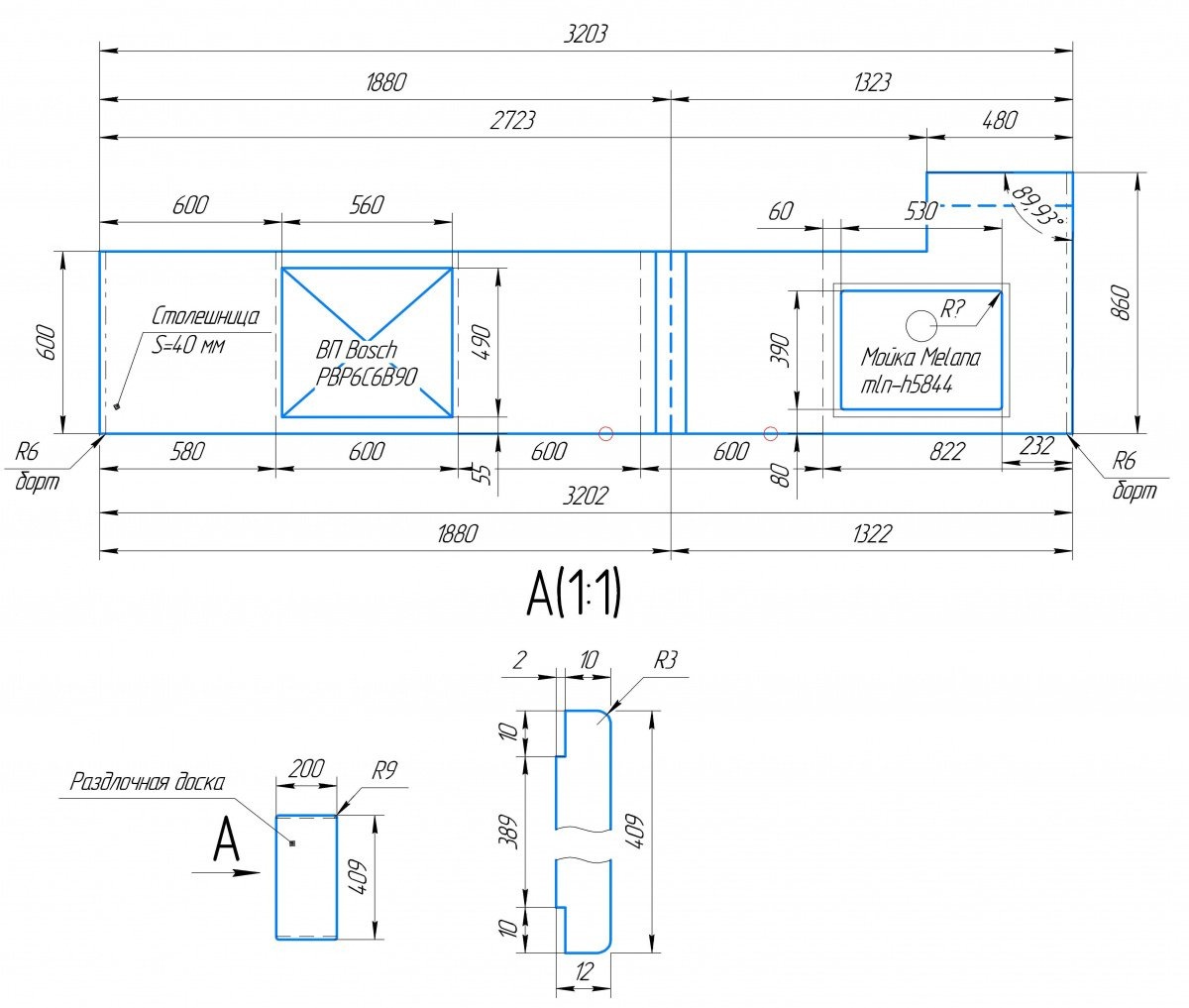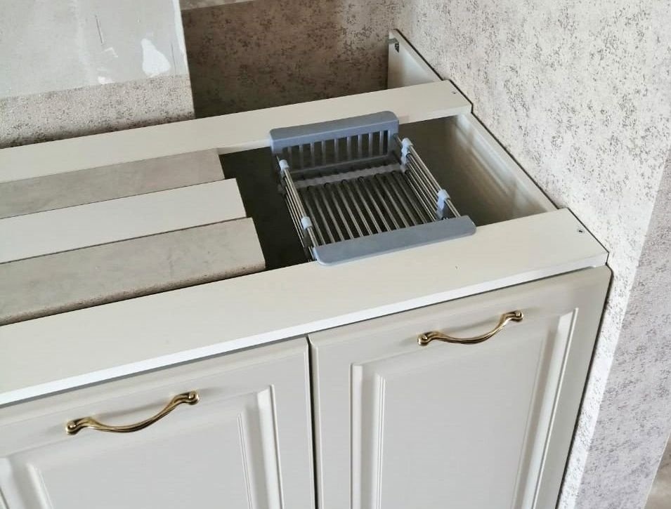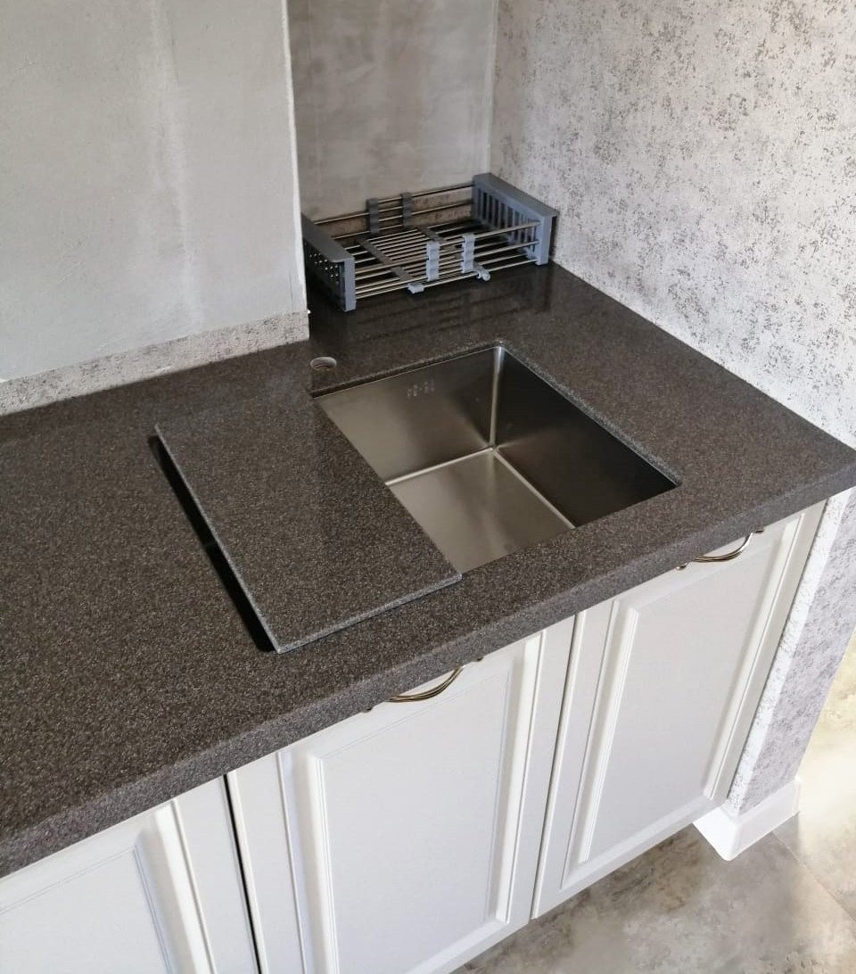 Заранее на столешнице сделан вырез под варочную панель с усилением и термозащитой. Мойка под интеграцию от компании Melana из нержавеющей стали. Она идет в комплекте с коландером (съемной чашей с отверстием для стекания воды).