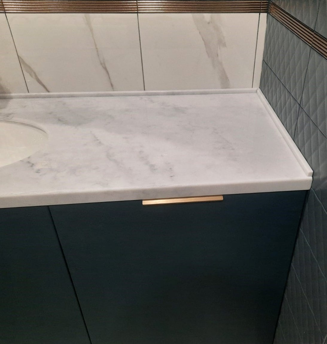 Столешница изготовлена из акрилового камня от производителя Akrilika, модель M649 в белом цвете с прожилками (под мрамор). Размер 1650х550 мм.