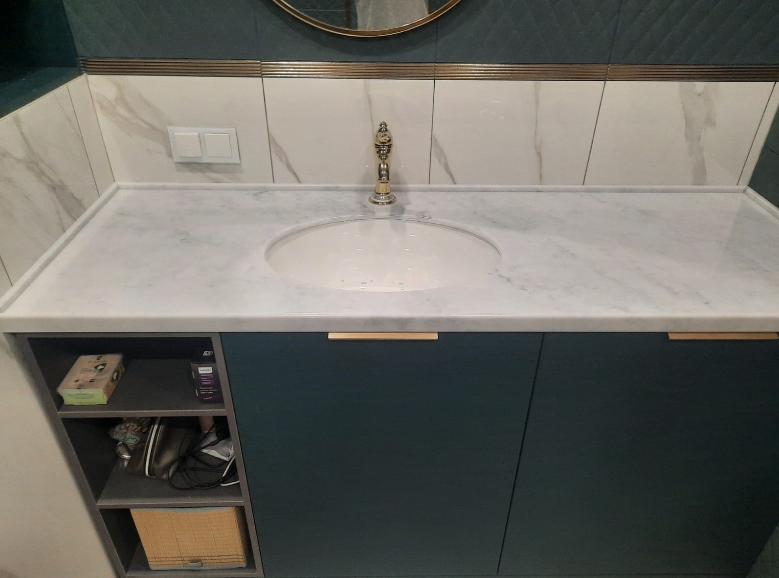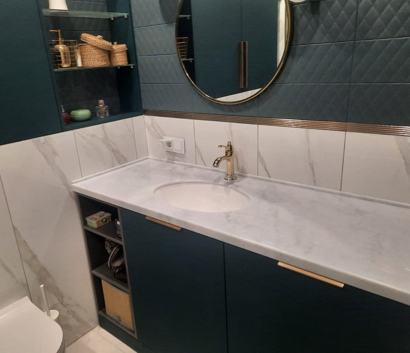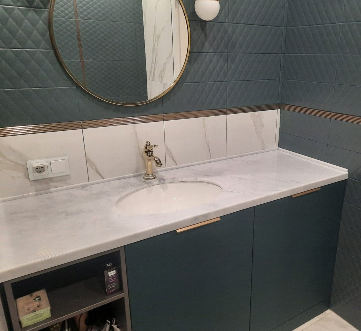 Столешница из искусственного камня прослужит вам долгие годы, даже в таких непростых условиях эксплуатации, как ванная комната.