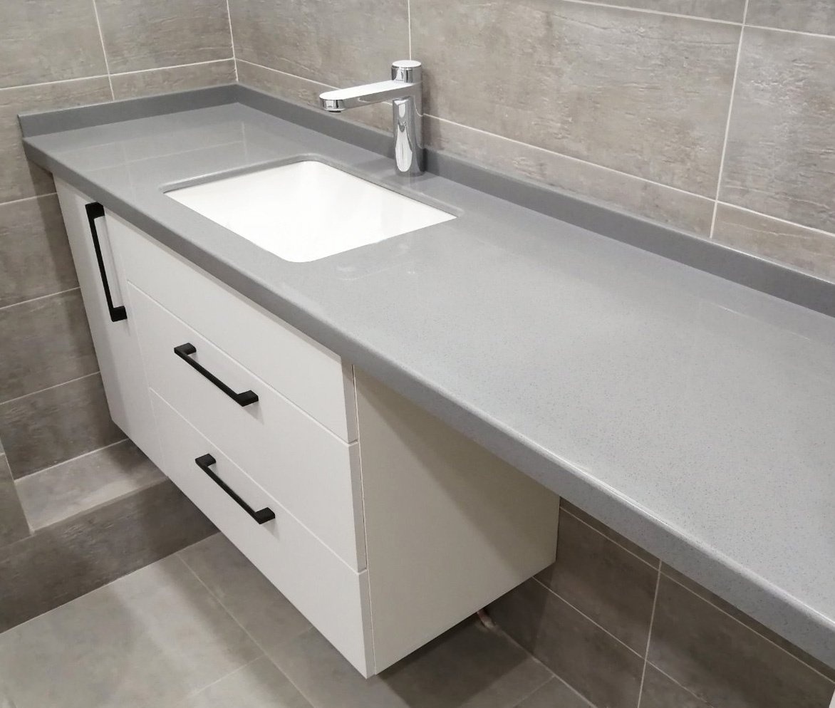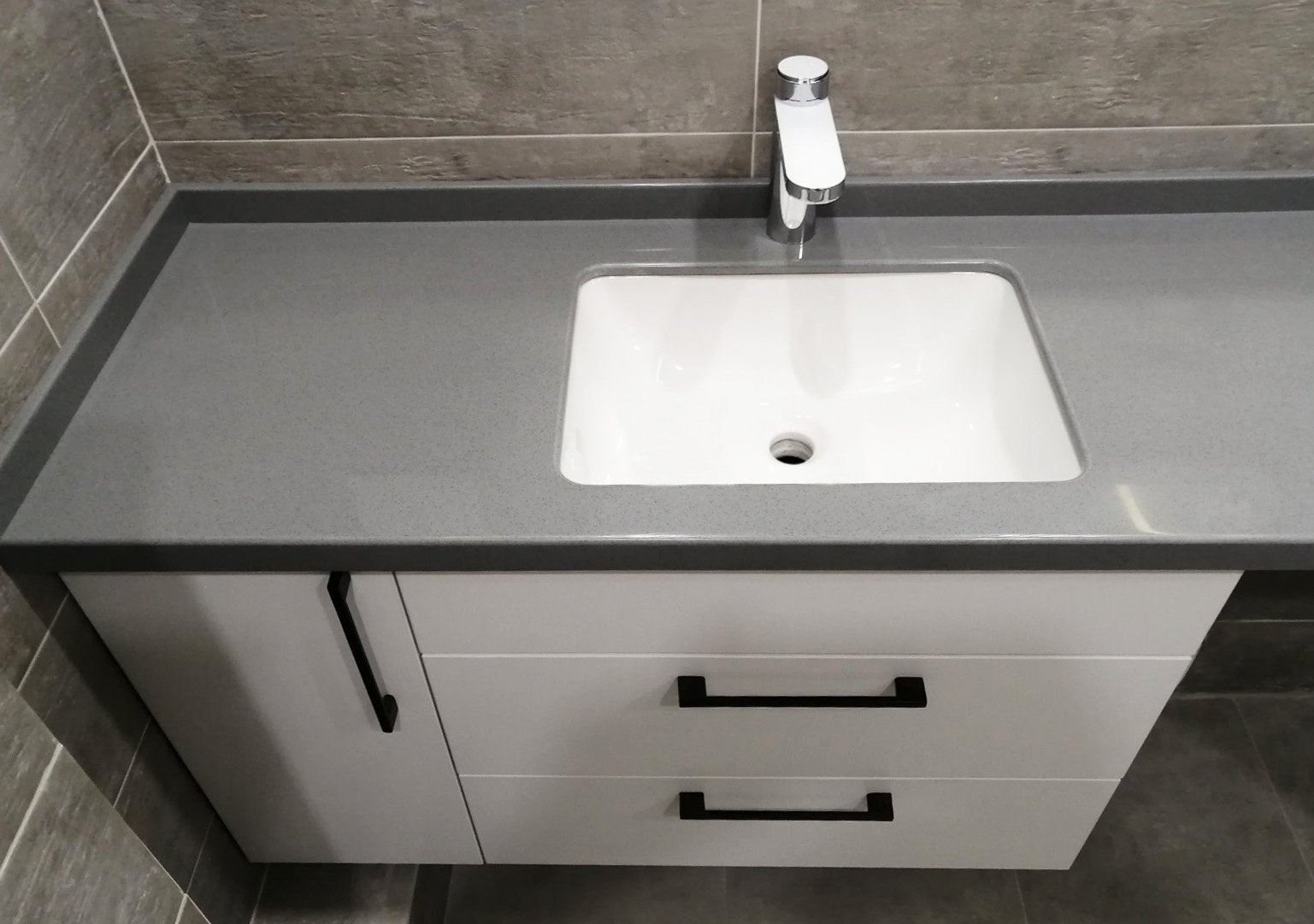 Дизайн ванной комнаты клиента был задуман в серо-белых тонах. Руководствуясь этим, мы изготовили столешницу серого цвета с белыми вкраплениями и с белой мойкой.