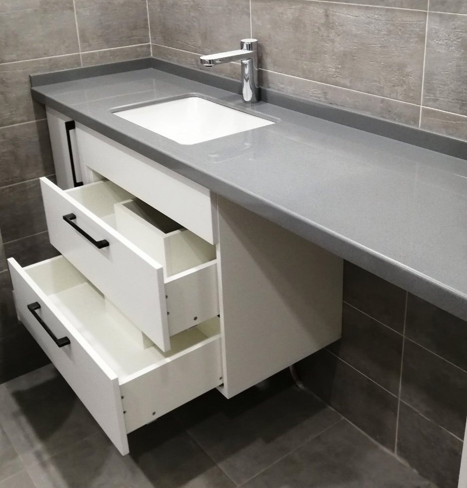 В этом проекте мы изготовили столешницу из акрилового камня для готовой тумбы от другой мебельной компании. Тумба подвесная с фасадами из мдф.
