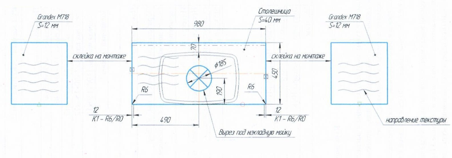 Камень для столешницы выбрали Grandex M718 в белом цвете. Также из акрилового камня изготовили 2 радиусные опоры (они называются радиусными за счет плавного перехода барной столешницы в опору). Заранее сделали вырез под накладную мойку с усилением.