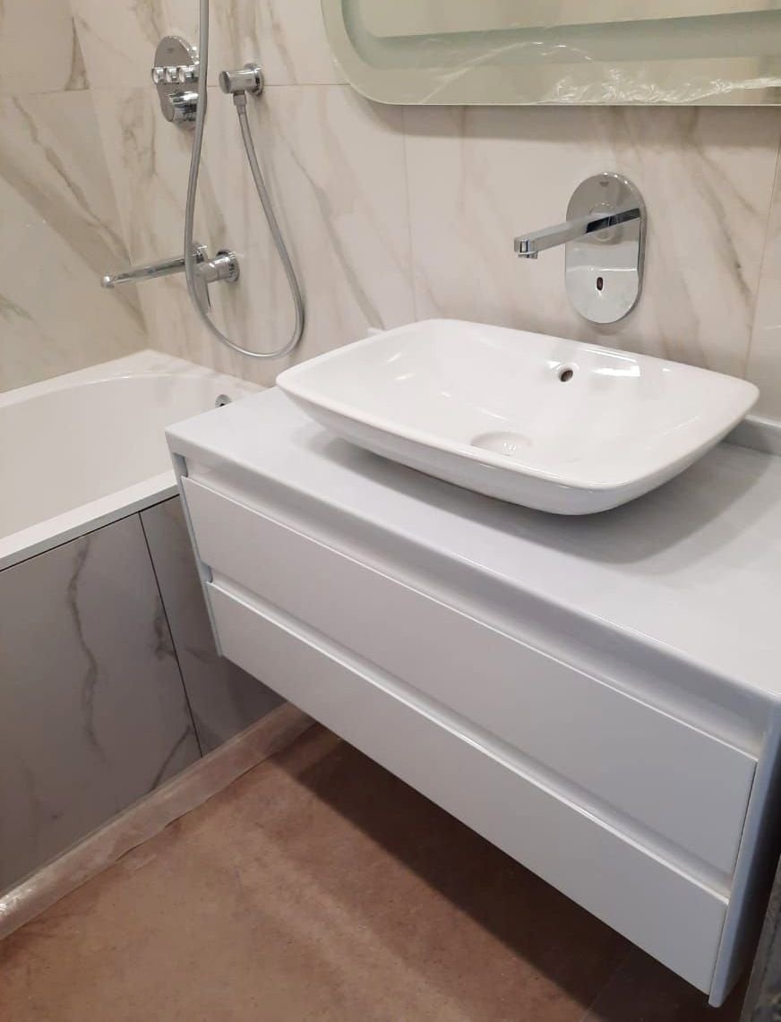 Для этого проекта мы изготовили столешницу из искусственного камня и тумбу для ванной комнаты. Эскиз создавали самостоятельно, учитывая все особенности расположения и, конечно же, пожелания заказчиков.
