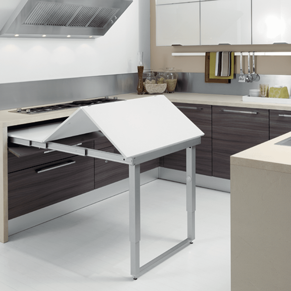 Двухуровневая модель отличается тем, что она находится выше или ниже основной рабочей поверхности. У нее может быть выдвижной, выкатной, поворотный механизм или она укрепляется специальными опорами.