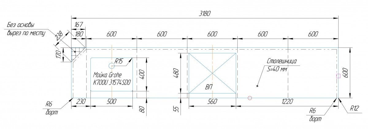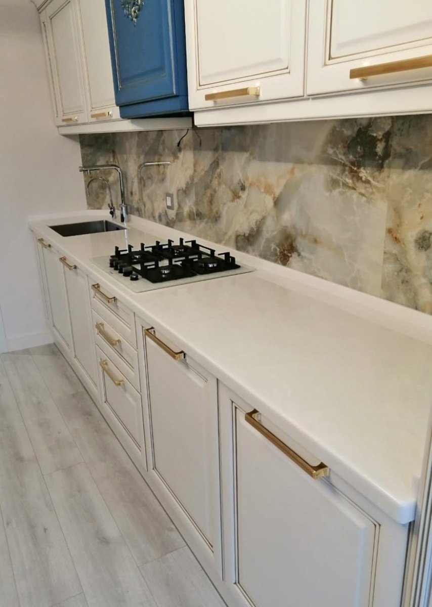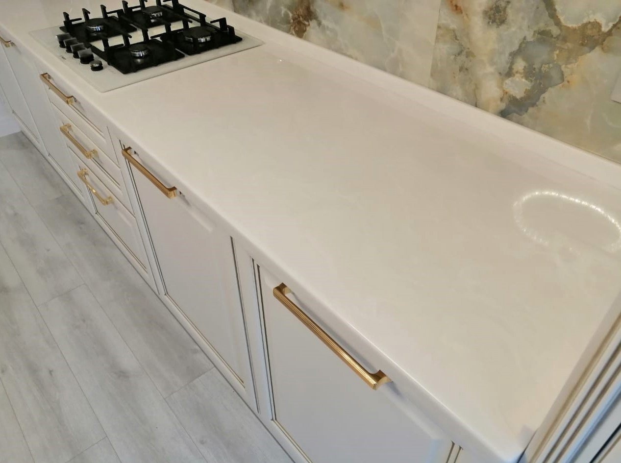Столешница изготовлена из акрилового камня производителя Hi-Macs, модель М603 в белом цвете. Размер 3180х600 мм. Дополнительно установлены накладные борты высотой 40 мм. Заранее сделан вырез под варочную панель и интегрированную мойку с усилением и термозащитой. Поверхность столешницы отполирована под глянец.