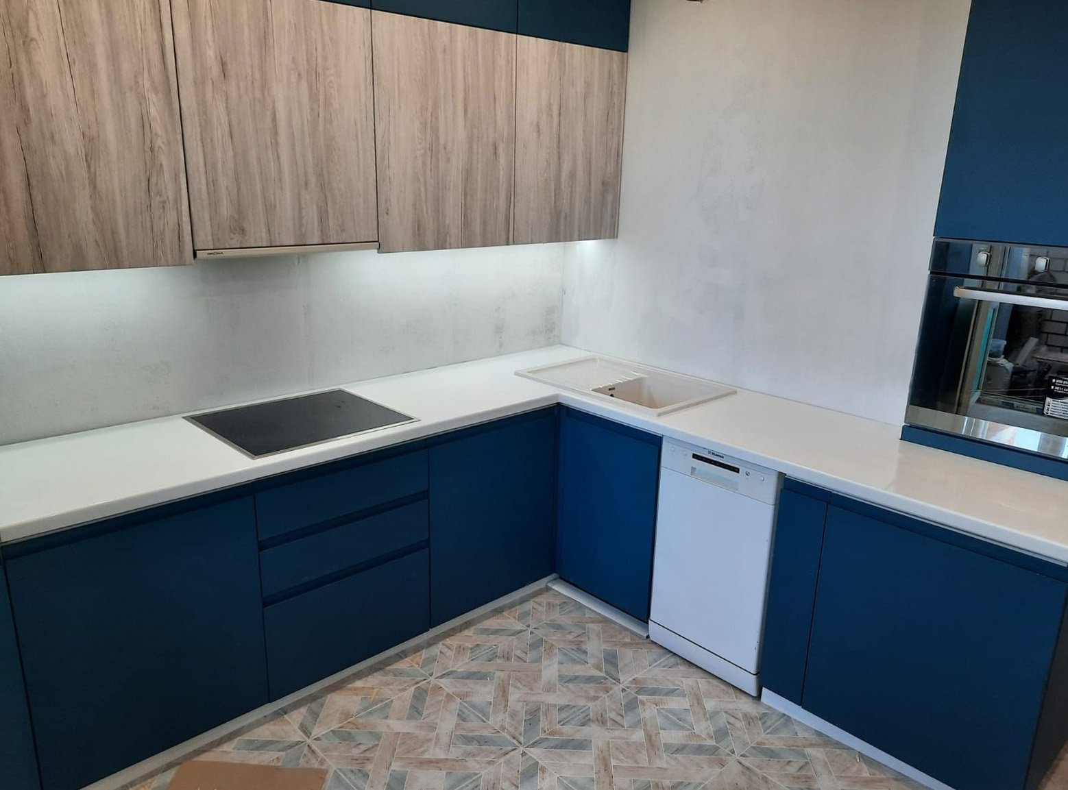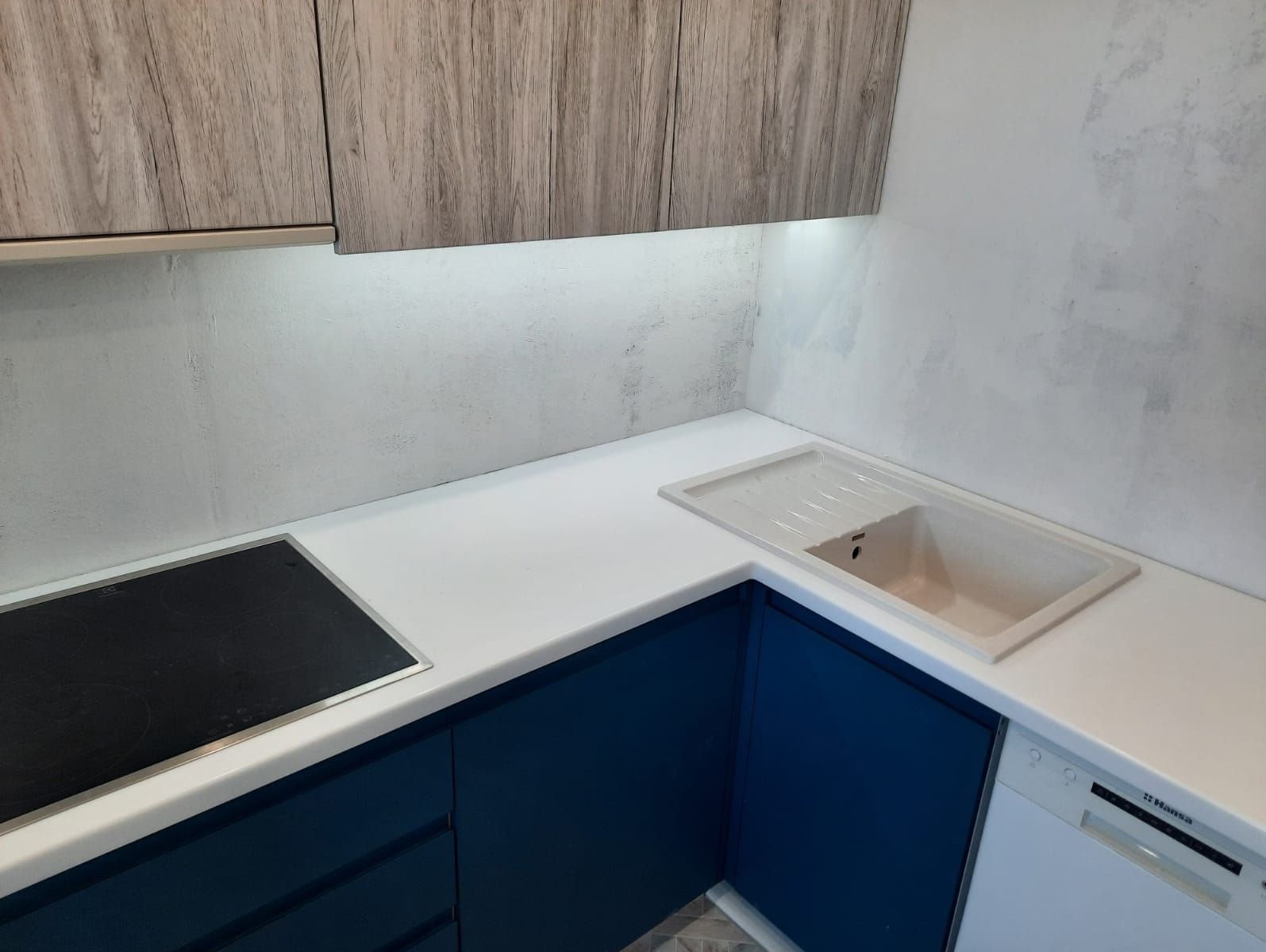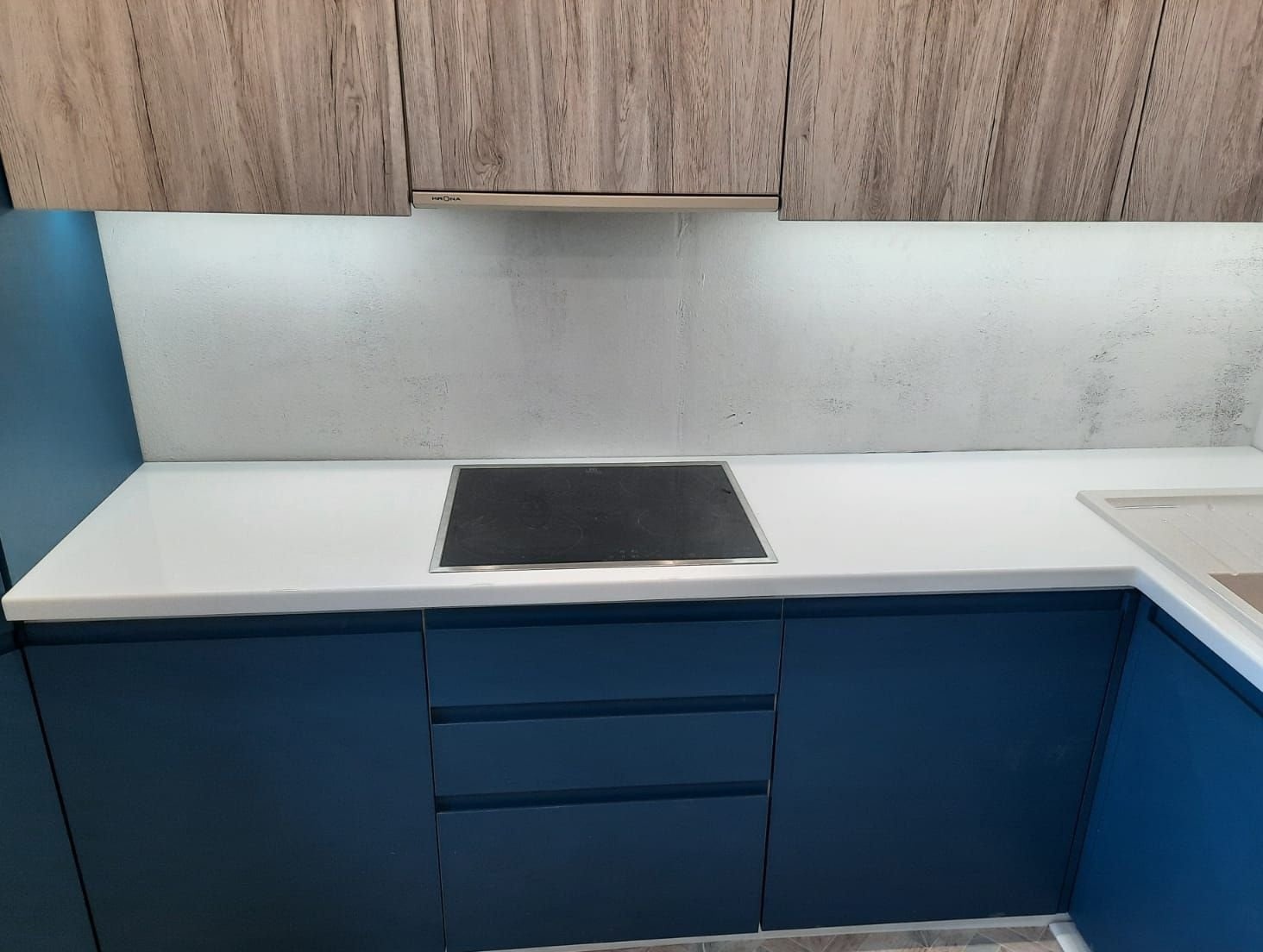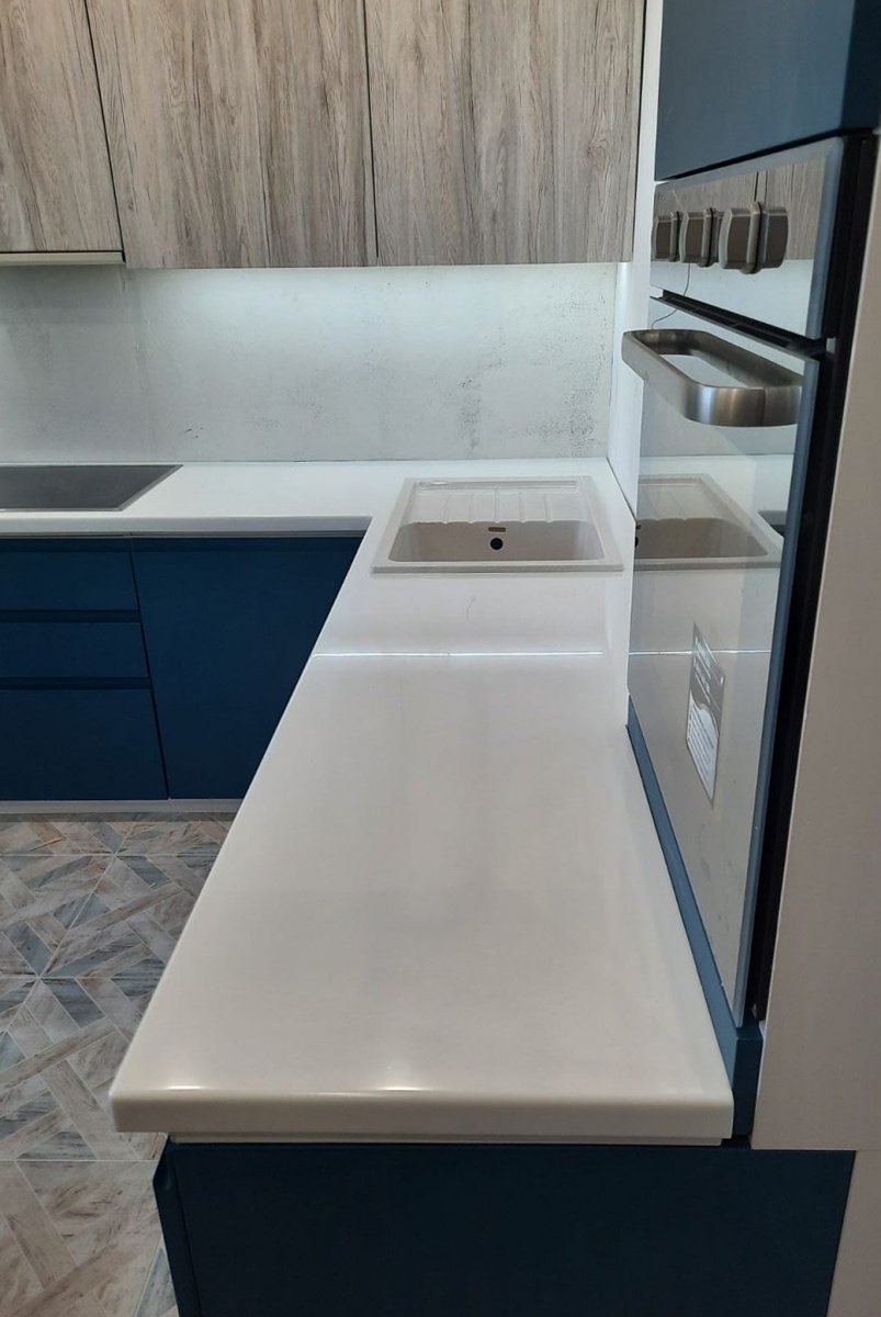 Столешница изготовлена из акрилового камня от производителя Hi-Macs P001, белый цвет с небольшими вкраплениями. Размер столешницы 2400х2270 мм. Поверхность отполирована.