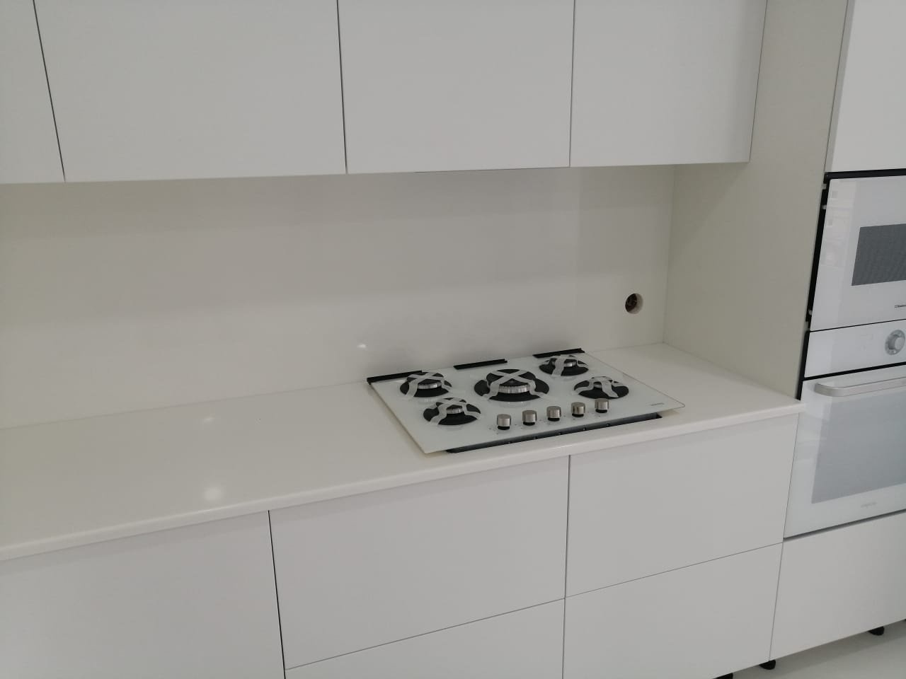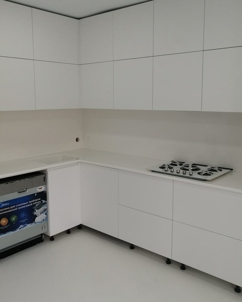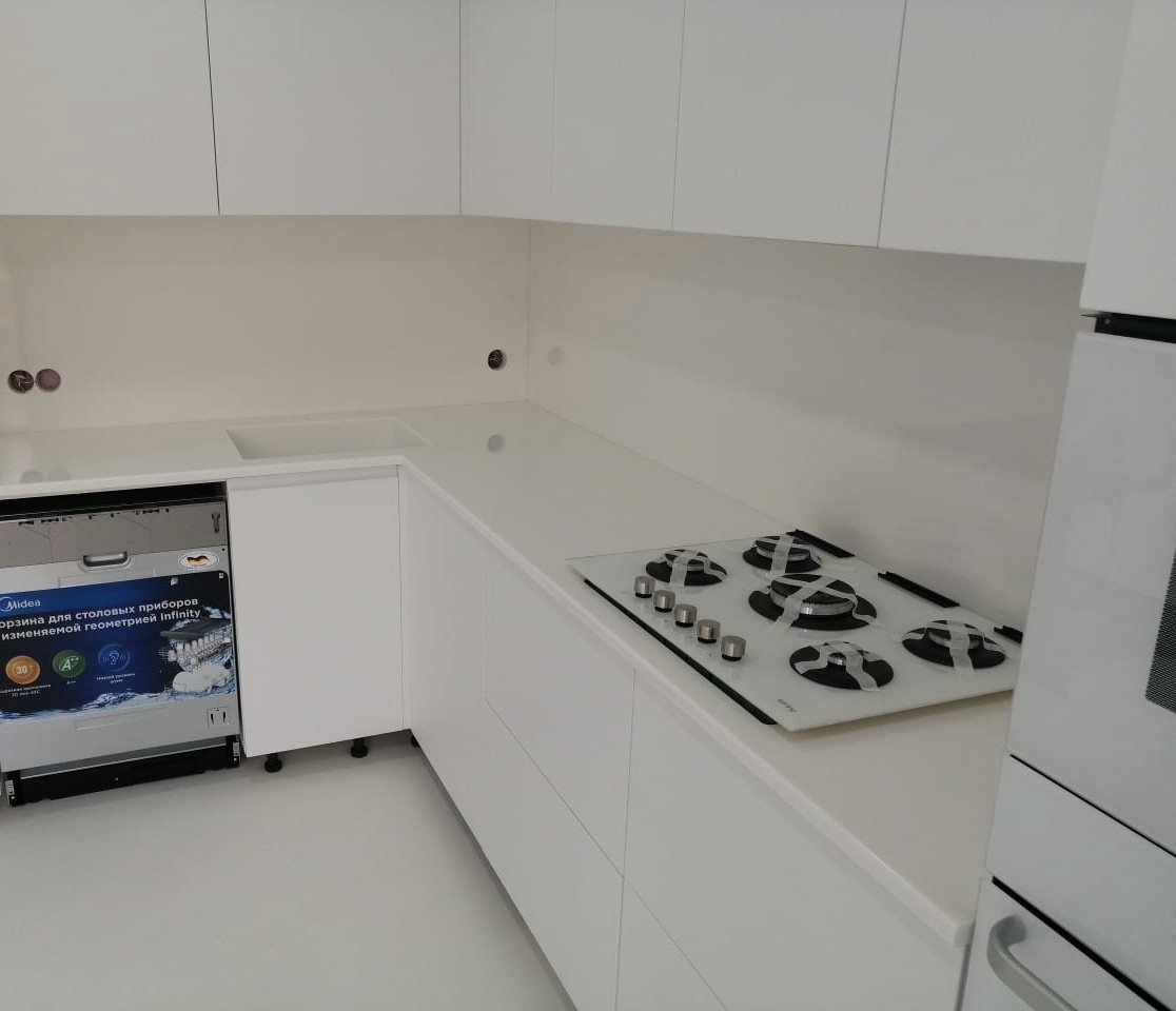 Столешница изготовлена из искусственного камня от производителя Staron, модель Sl414. Белый цвет без вкраплений – универсальный и самый бюджетный из линейки акриловых камней.