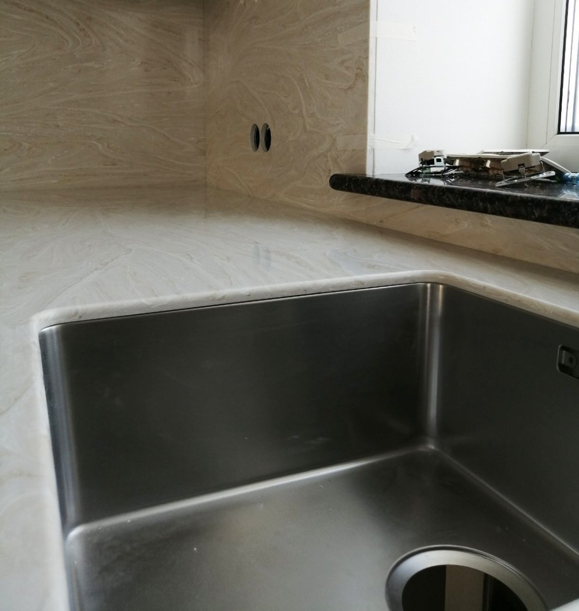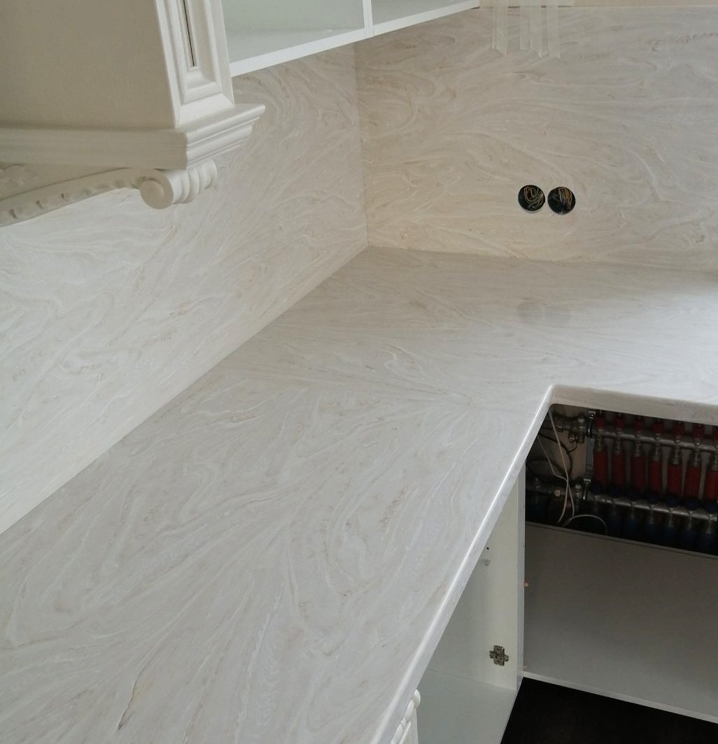 Искусственный камень мы использовали Grandex M717. Цвет: бежевый с текстурой (разводами). Он не впитывает в себя влагу и абсолютно безопасен для окружающей среды.