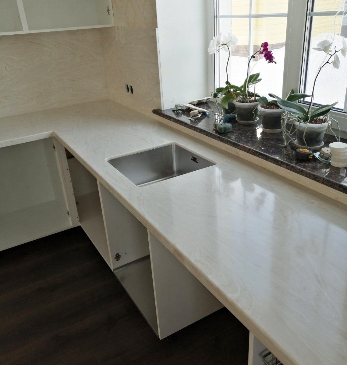 Предварительно в столешнице сделали вырезы под варочную панель и мойку. Мойку установили интегрированную Blanco ANDANО 400-U. Материал: нержавеющая сталь с зеркальной полировкой.