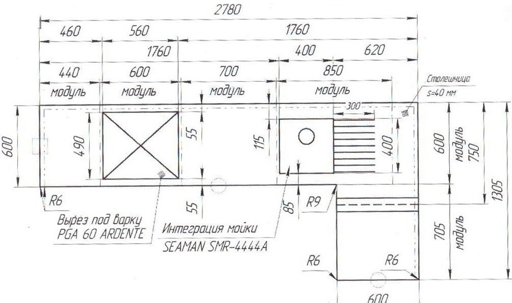 Столешница изготовлена из акрилового камня (Corian Sorrel (4)). Цвет достаточно интересный - коричневый с белыми и черными разводами (напоминает космос). Конструкция самой столешницы не имеет швов, что предотвращает скапливание грязи и образование бактерий. Сделаны вырезы под варочную панель и мойку из нержавеющей стали. Срок службы подобной столешницы более 50 лет.