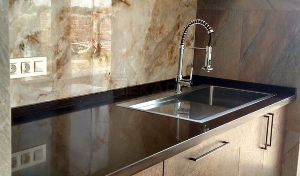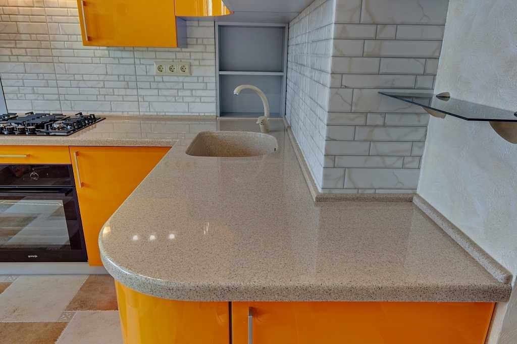 Камень, будь то натуральный или искусственный, подходит для рабочей зоны кухни. Он отличается повышенной прочностью, не требует особого ухода и устойчив к влаге, а также перепадам температуры. Однако цена на них различается (натуральный камень значительно дороже), а искусственный камень считается более гигиеничным за счет отсутствия пористости.