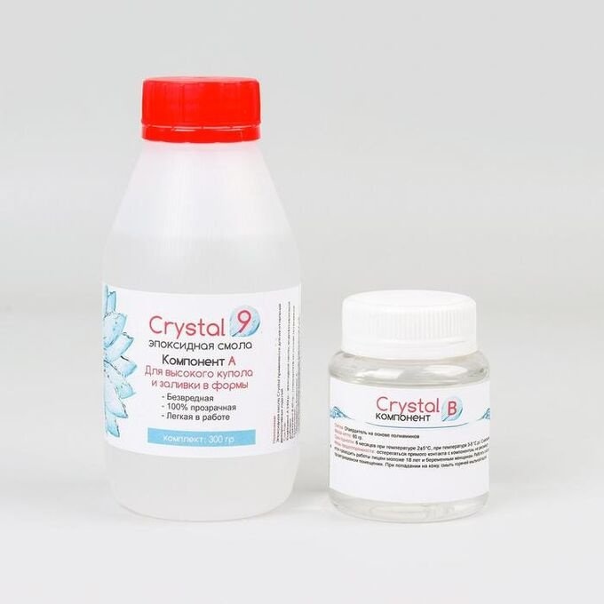 Crystal Glass, производимая в Ярославле – универсальный материал, предназначенный для различных видов заливки и создания изделий. Поставляется она в практичных пластмассовых бутылочках, содержащих 200 г продукта. Комплект также включает отвердитель, необходимый для полимеризации смолы.