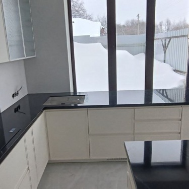 Вторым этапом стал массивный угловой стол с открытыми полками и вместительными ящиками. Практичные черные ручки гармонично сочетаются с общей концепцией. Стол идеально подходит для работы — на открытых полках можно разместить необходимые материалы, а в ящиках организовать хранение документов и мелочей.