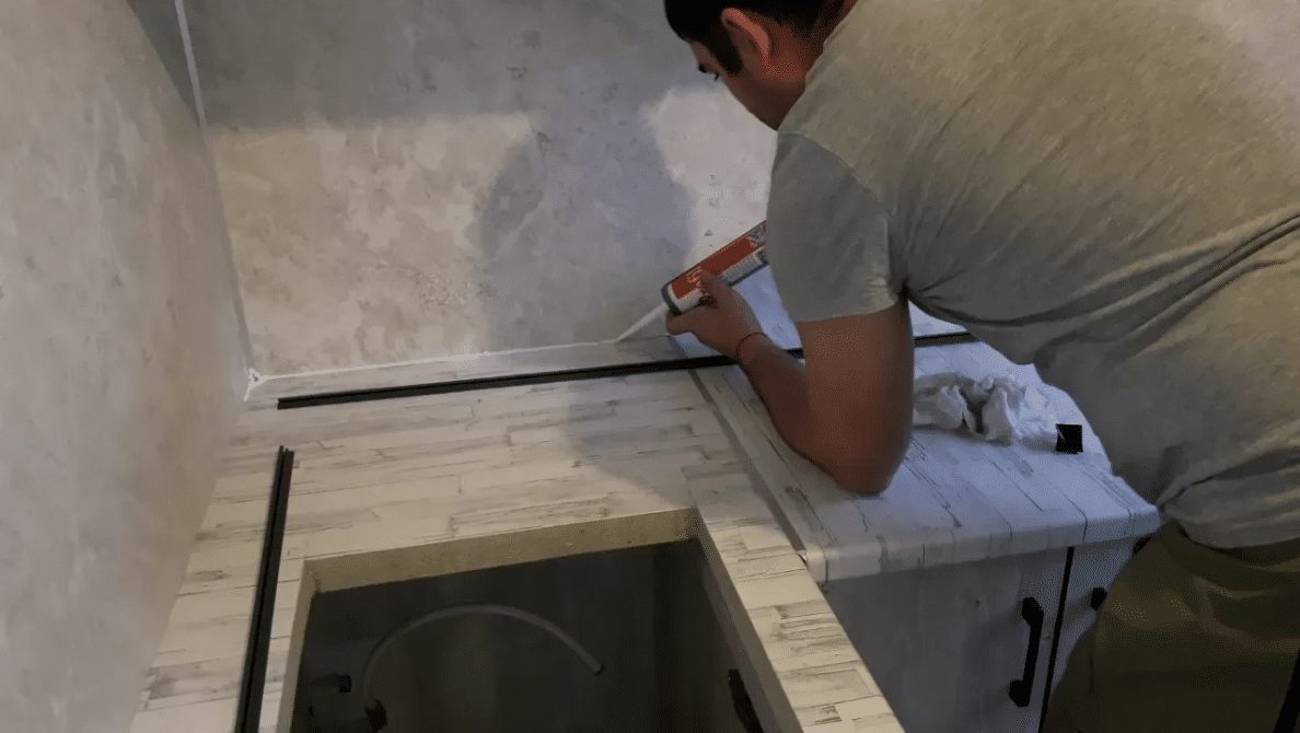 Если бордюр соответствует параметрам, то обезжирьте место, на которое собираетесь установить его. После этого воспользуйтесь герметиком и нанесите его на столешницу. Остается только хорошо прижать плинтус.