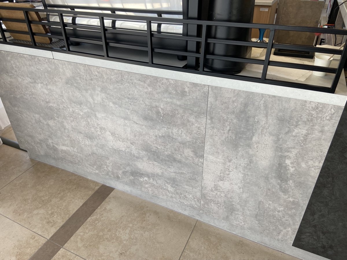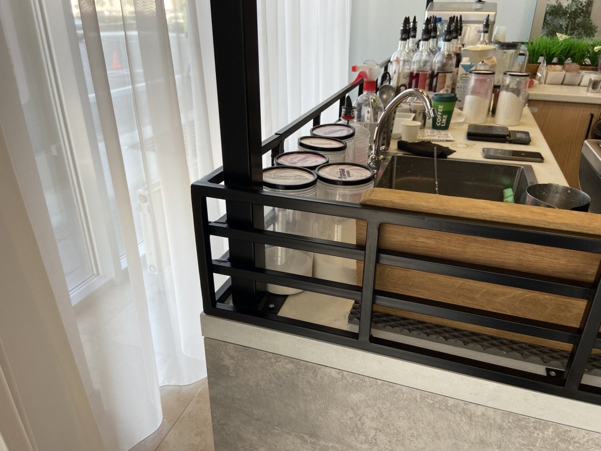 Установили столешницу из акрилового камня и черный металлокаркас по бокам стойки.