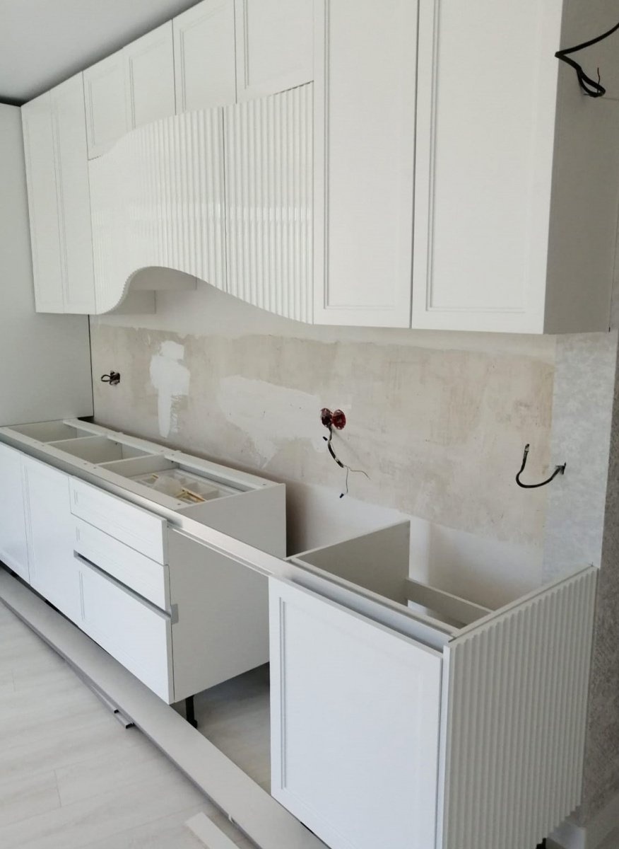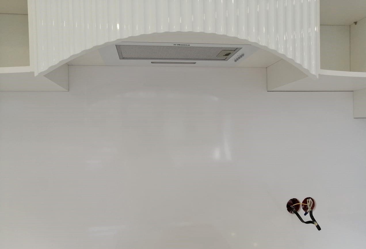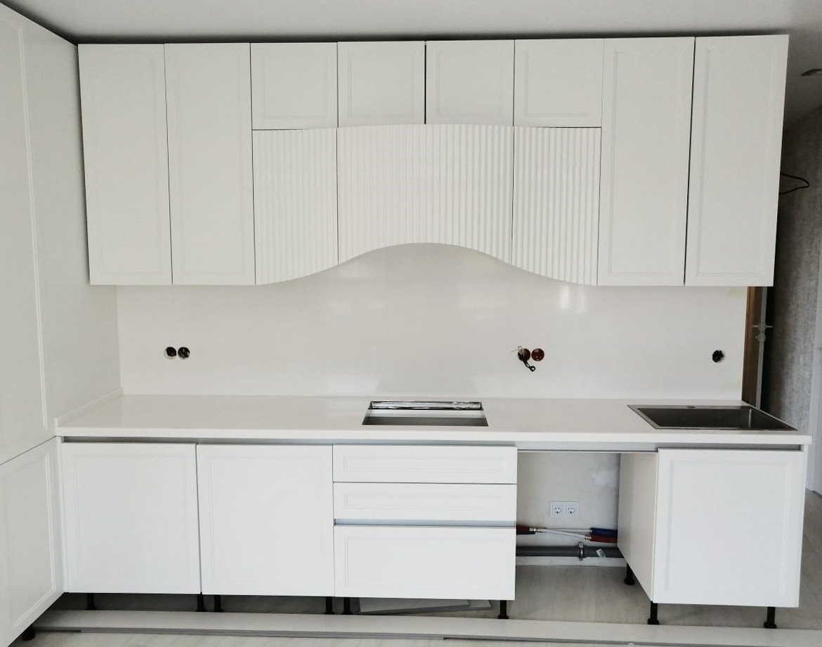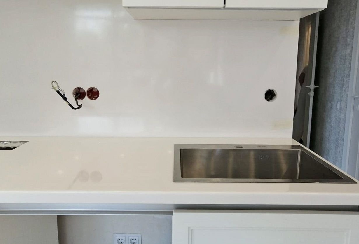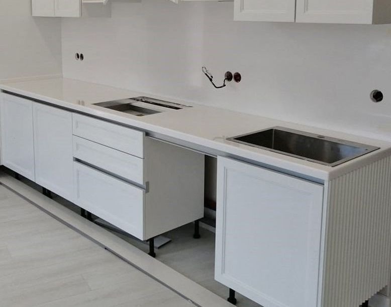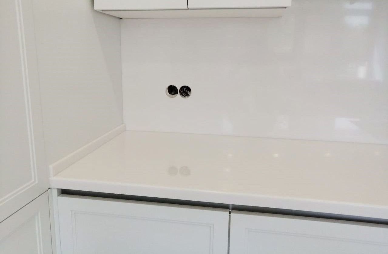 Кухонная столешница изготовлена из акрилового камня от производителя Grandex, серия S-203 в белом цвете.