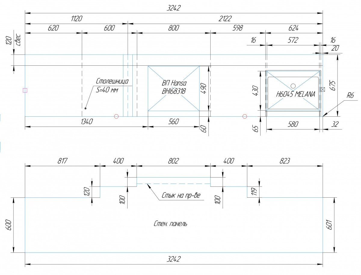 Столешница прямая, размером 3242х675 мм., с вырезами под варочную панель и мойку. Дополнительно изготовлена стеновая панель нестандартной формы, размером 3242х820 мм.