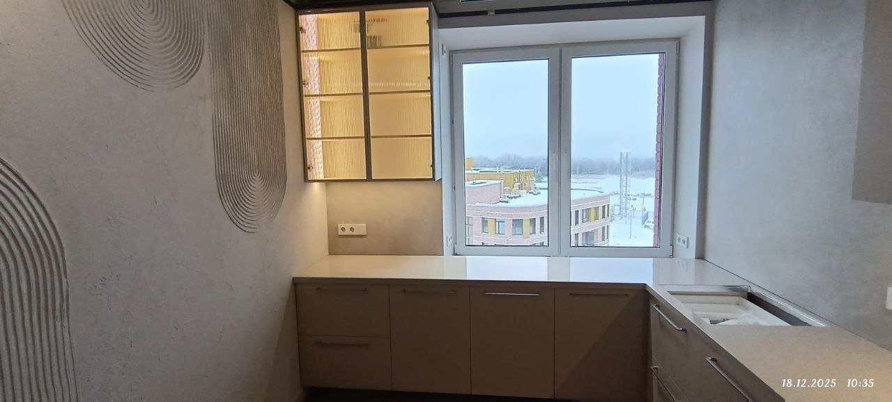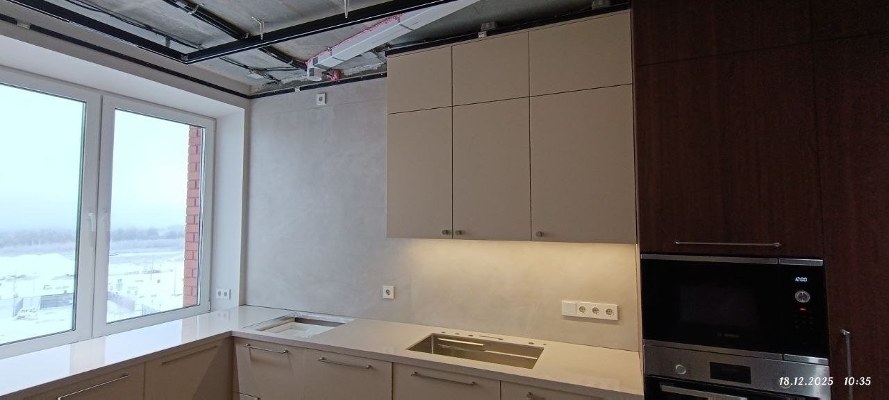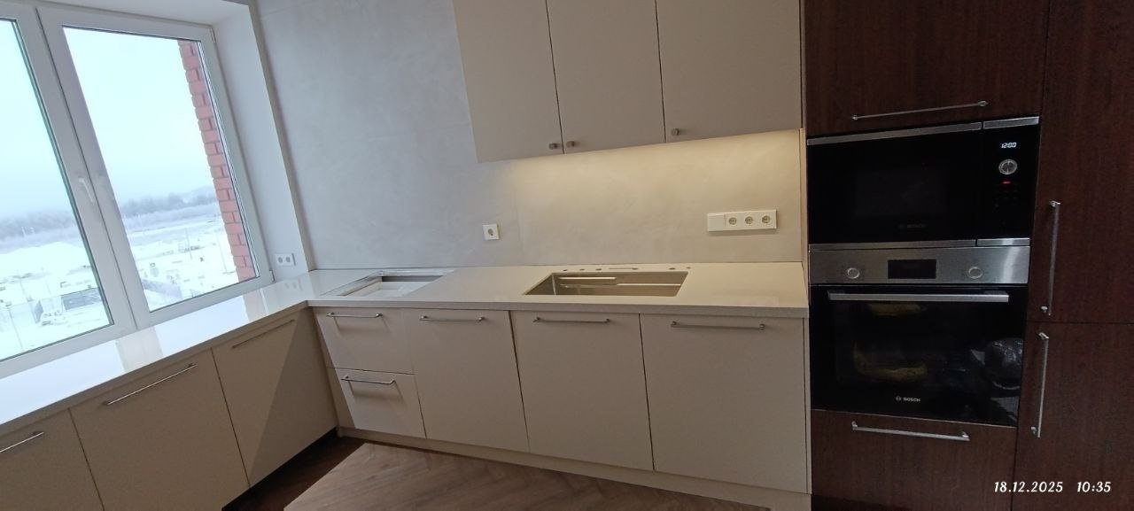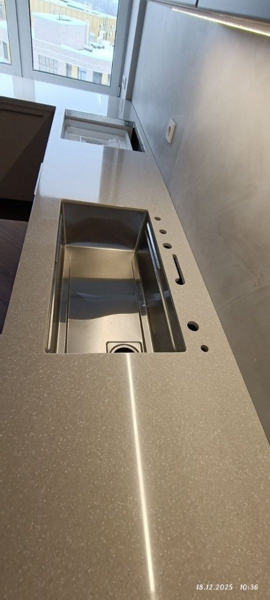 Кухонный гарнитур с каменной столешницей. Акрил Hi-Macs G 038 Sea Oat Quartz — это материал серо-бежевого цвета с имитацией текстуры кварца, который добавит интерьеру спокойствие и стиль.