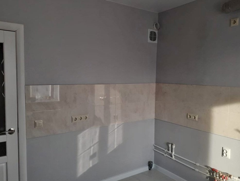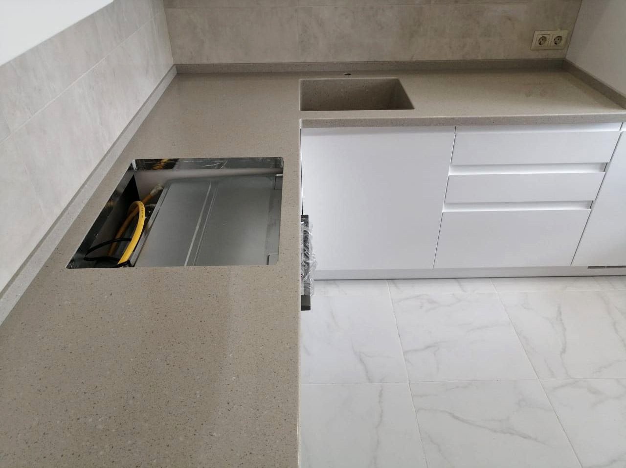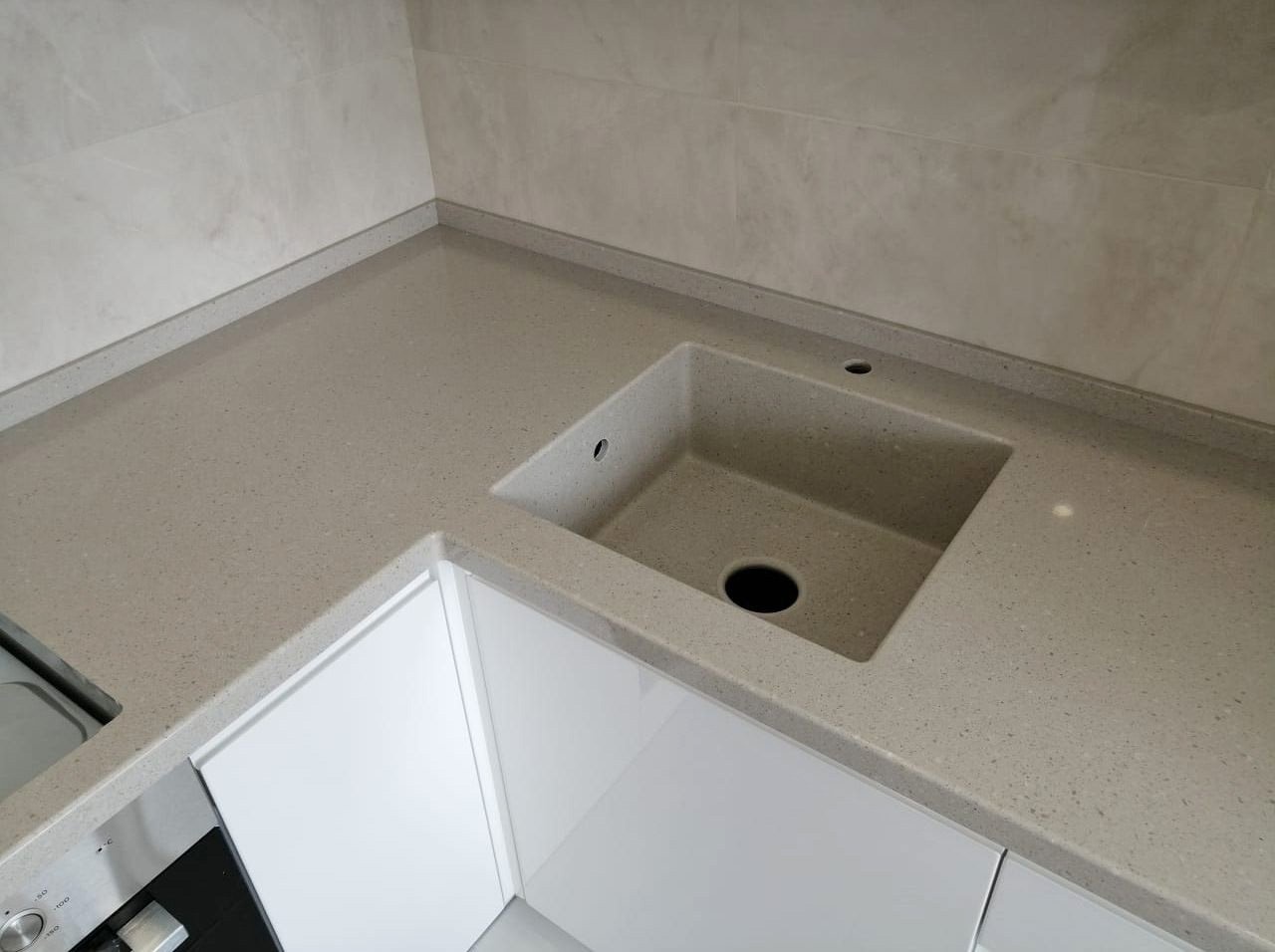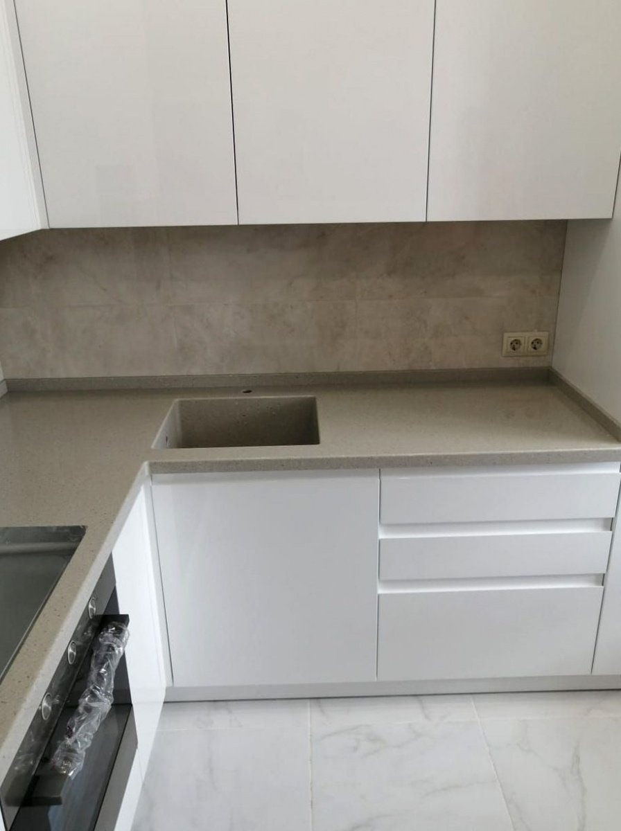 Столешница изготовлена из акрилового камня от производителя Hi-Macs G137, цвет Winter Grey. Размер столешницы 1975х1860 мм.