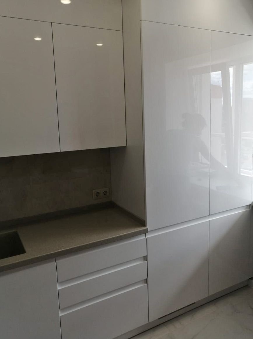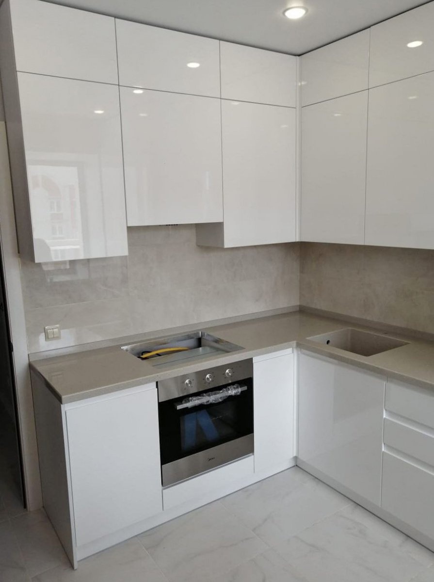 Корпус изготовлен из ЛДСП в цвете «белый снег». Фасады МДФ эмаль белый глянец. Нижние фасады с фрезеровкой под ручки, верхние фасады без фрезеровки.