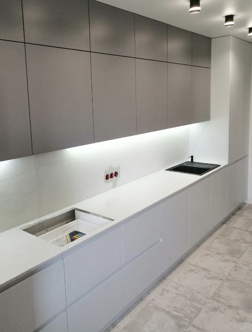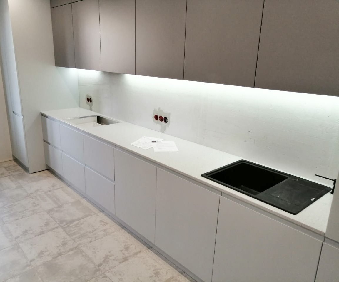 Столешница изготовлена из акрилового камня Hi-Macs W002, в бежевом цвете с вкраплениями.