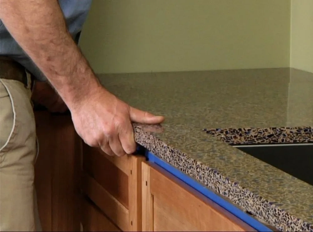 Важно! Следует использовать малярный скотч для аккуратного распиливания модулей. Его приклеивают в местах распилов. Это гарантирует, что материал получит ровный срез. Применение защитных пропиток от влаги и герметиков повышает износостойкость столешницы при эксплуатации.
