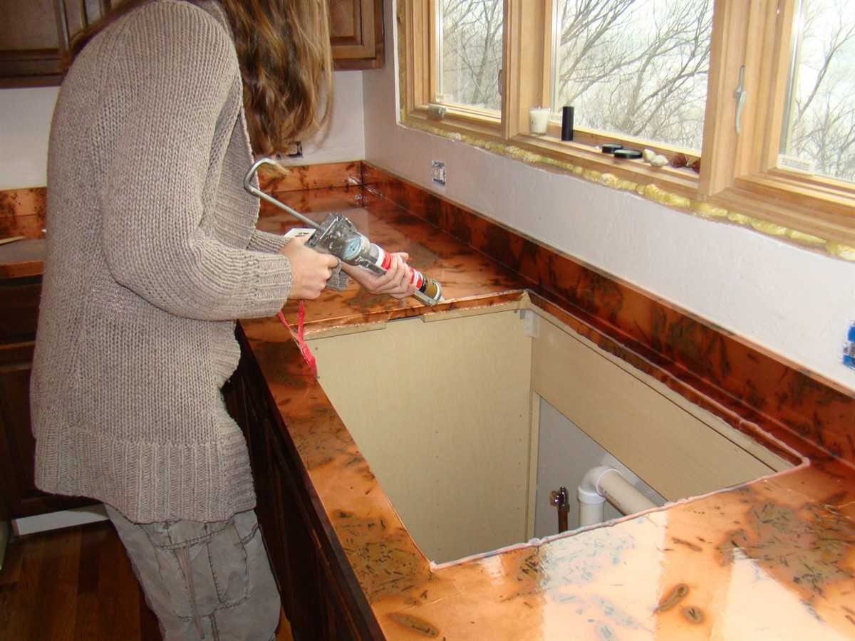 В последнюю очередь проводят герметизацию стыков со стенками, раковиной, плитой, другими модулями мебели. Герметиком промазывают все стыки и щели в местах соединения. Выжидают полного высыхания, 100 % герметизация защитит столешницу и мебель от попадания в труднодоступные места влаги и загрязнений, а значит, мебель прослужит дольше.