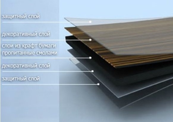 На выходе получается продукт в виде термореактивной пластмассы, он выглядит как самонесущая, твердая пластиковая плита. Сверху на пластик наносится декоративный слой и далее защитный, износостойкий слой. Есть модели с нанесением декора и защиты с двух сторон (сверху и снизу).