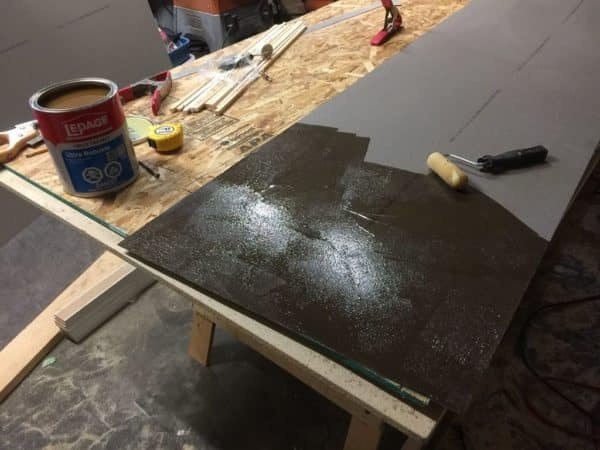 Выбрав вариант столешницы, на основании (из прочного ДСП, МДФ или влагостойкой фанеры) и ламинате отмеряют требуемые мерки. При помощи карандаша и измерительной ленты делают «выкройку» модулей. Если все элементы нужно склеивать, то подготавливают кисти, клей. Если ламинат с клеевой основой (снизу), то его приклеивают к основанию, снимая защитный слой бумаги снизу. В случае, если не нашлось ДСП нужной толщины, склеивают панели тонкой ДСП в два слоя.