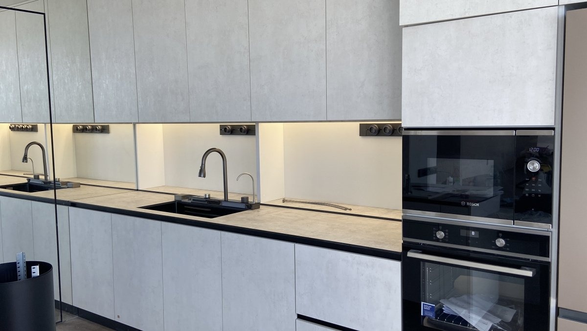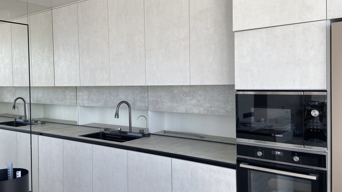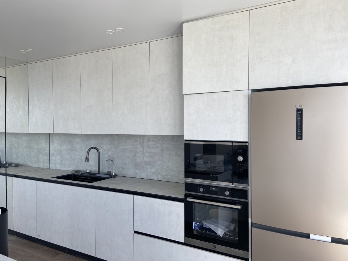 На кухне мы создали полноценный кухонный гарнитур и столешницу из высококачественной компакт-плиты HPL, устойчивой к влаге и царапинам. Встроенная мойка интегрирована в поверхность, а рядом расположены специально отведённые места под холодильник, духовку и микроволновую печь, что обеспечивает эргономичное использование пространства. Также мы установили задвижные стеновые панели с внутренней подсветкой. Гарнитур достигает потолка, что увеличивает возможность хранения. Слева от кухонного гарнитура расположено огромное зеркало на всю стену, что визуально расширяет комнату и добавляет светлоты.