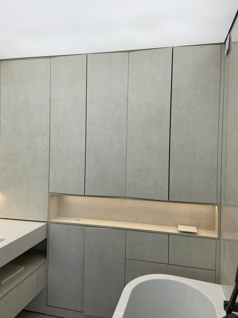 В санузле был выполнен комплексный проект по изготовлению и монтажу мебели. Мы сделали столешницу из акрилового камня с интегрированной раковиной, что обеспечивает лёгкую очистку и долговечность. Под раковиной установлен шкафчик для хранения. Между шкафом и раковиной мы разместили полку, например, для полотенец или декоративных элементов. Справа от раковины расположены серые шкафчики, которые занимают всю стену, что позволяет максимально эффективно использовать пространство. В центре композиции — полка с подсветкой.