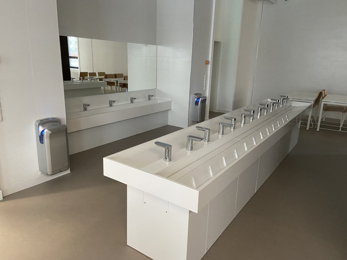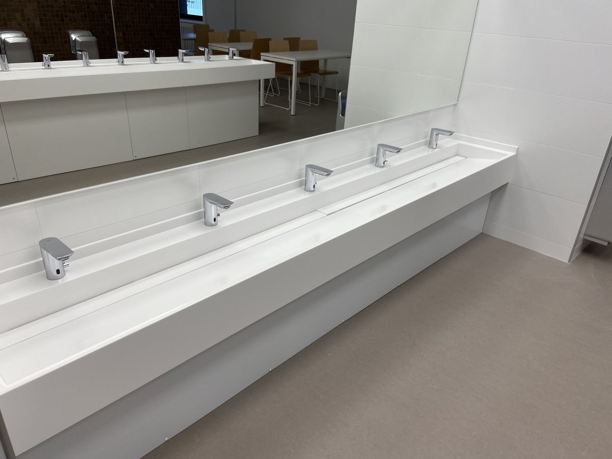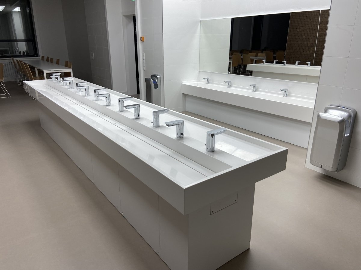 Раковина оснащена 13 смесителями, что позволяет одновременно использовать раковину нескольким людям, что особенно важно при большом потоке учеников и сотрудников. Надежное и удобное размещение смесителей делает процесс мойки более эффективным.