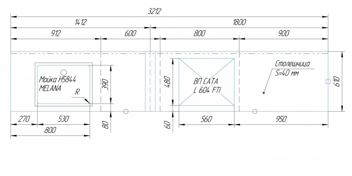 Заранее сделан вырез под варочную панель с усилением и термозащитой. Мойка Melana, с монтажом под интеграцию.