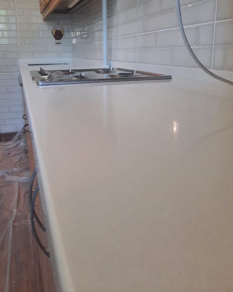 Столешница изготовлена из акрилового камня от производителя Grandex, модель S-217 в белом цвете с вкраплениями. Размер 3200х600 мм.