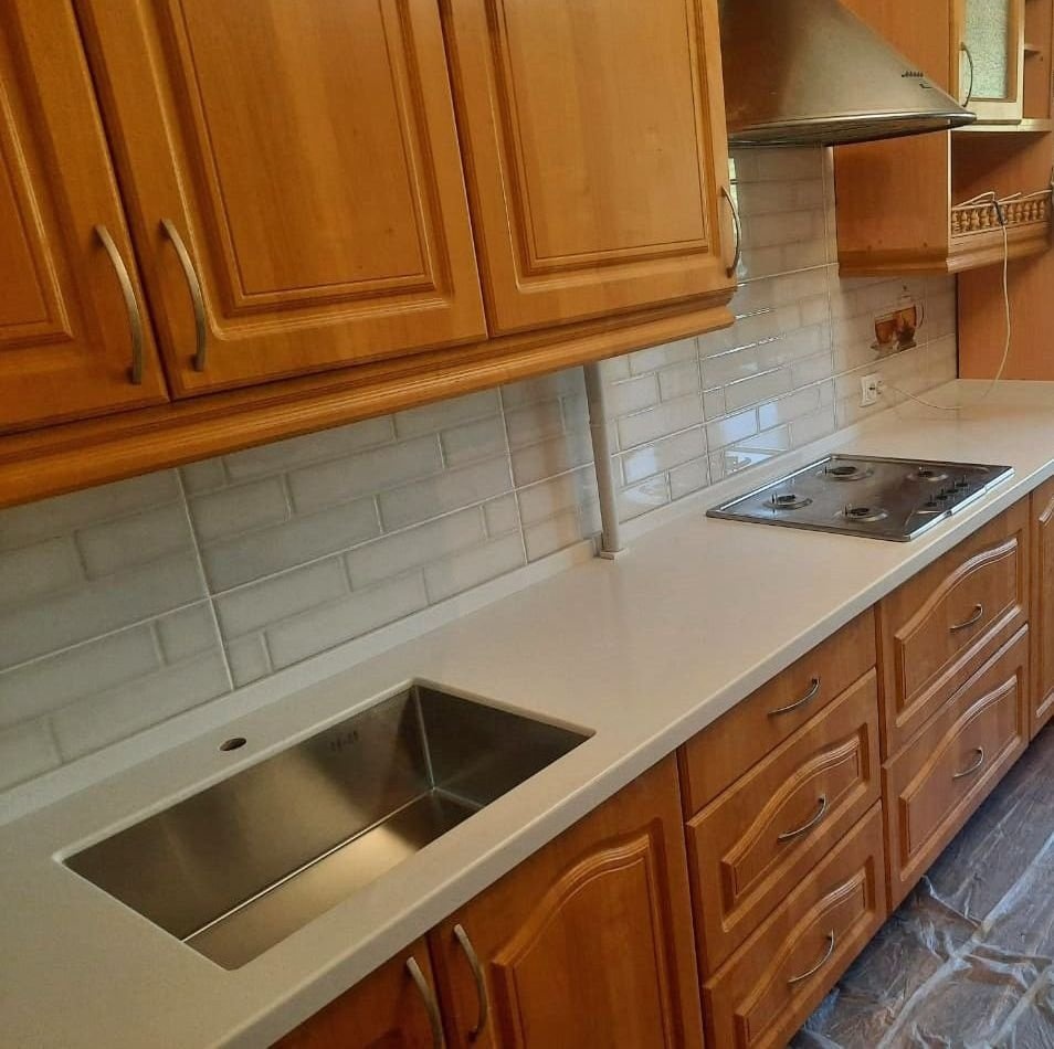 Чтобы обновить кухню, не обязательно менять кухонный гарнитур. Достаточно заменить старую столешницу на новую, из искусственного камня.
