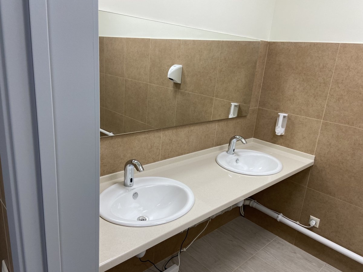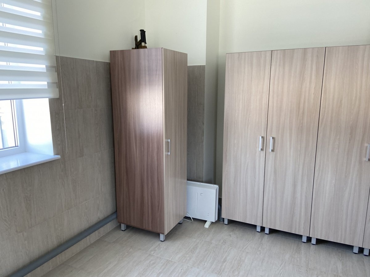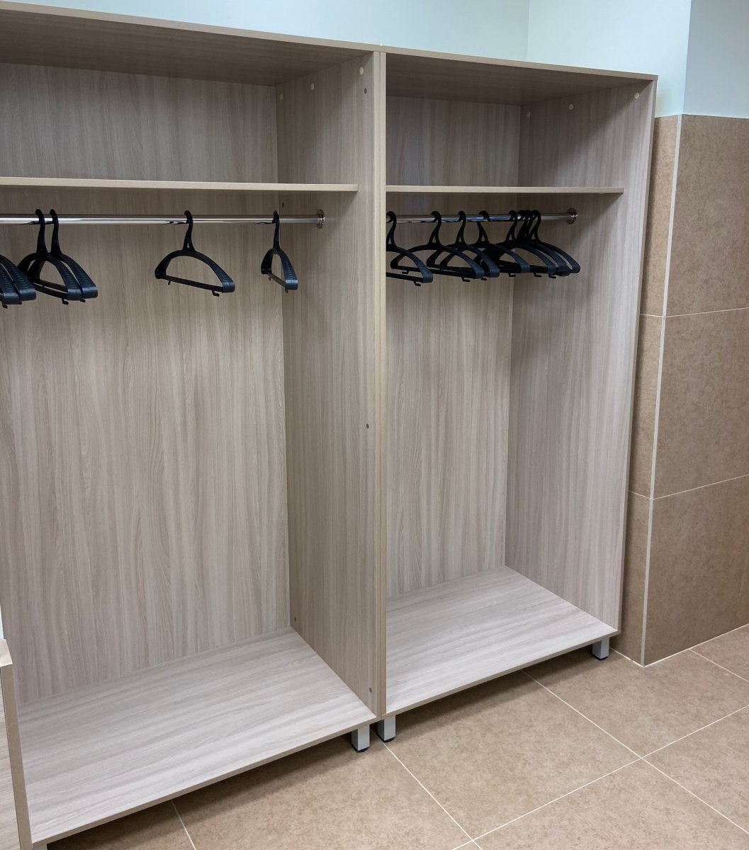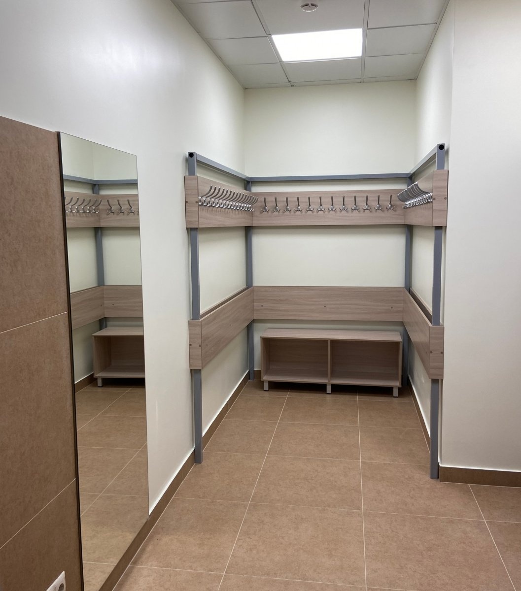 Для раздевалок мы установили открытые шкафы с карнизами для вешалок. Это решение обеспечивает достаточный объем для хранения одежды и помогает поддерживать порядок в зоне сменной одежды. Кроме того, для гардеробных уголков были созданы специальные места с вешалками и стеллажами для обуви.