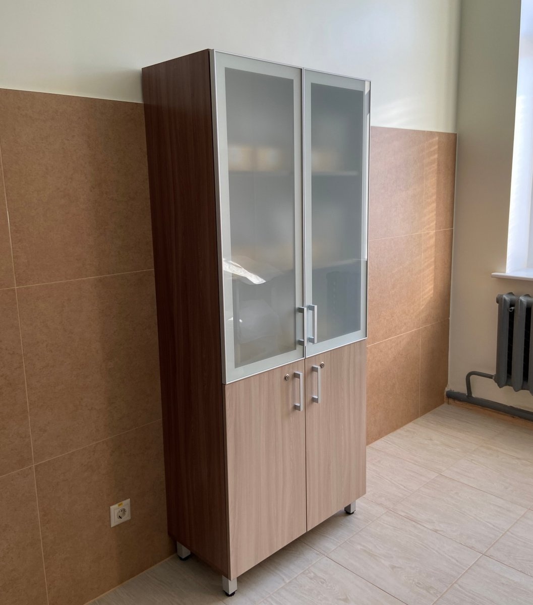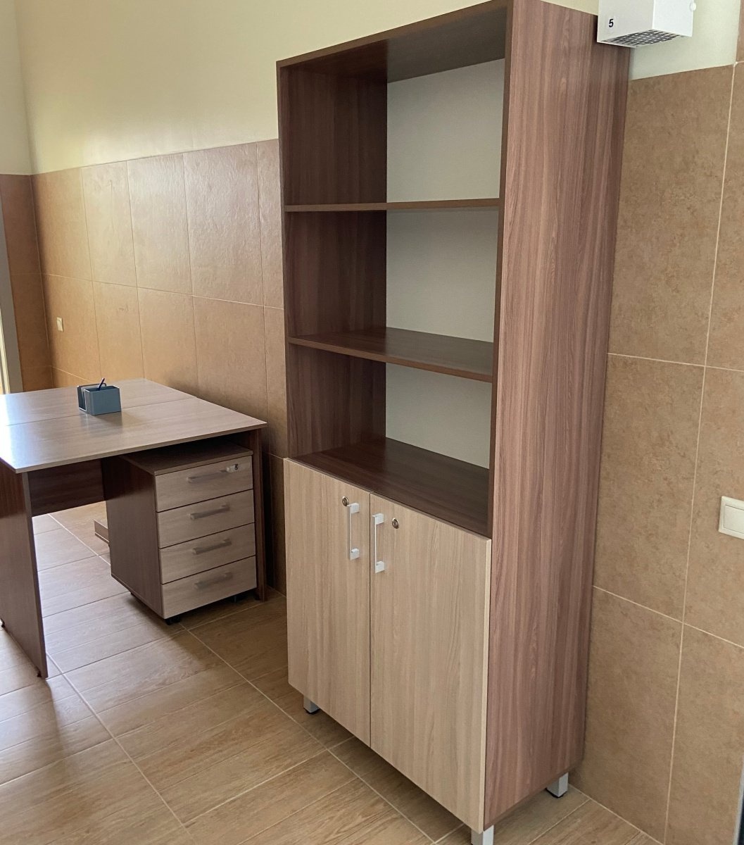 Первым этапом нашего проекта стало изготовление разнообразных шкафов разного размера и вида. В медицинском пункте были установлены шкафы с открытыми полками, что позволяет медперсоналу удобно хранить медикаменты, инструменты и документацию. Также мы создали полностью закрытые шкафы для более надежного хранения, а стеклянные дверцы в некоторых моделях обеспечивают быстрый доступ и позволяют визуально контролировать содержимое, что особенно важно в условиях медицины.