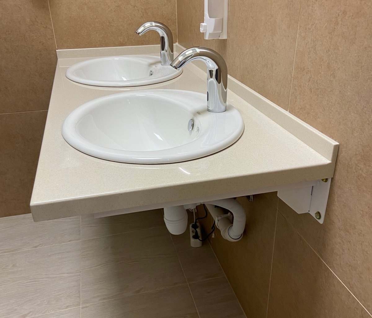 Изготовили столешницу с интегрированными раковинами для санузлов. Бесшовная поверхность из искусственного камня с защитными бортиками для предотвращения разбрызгивания воды.