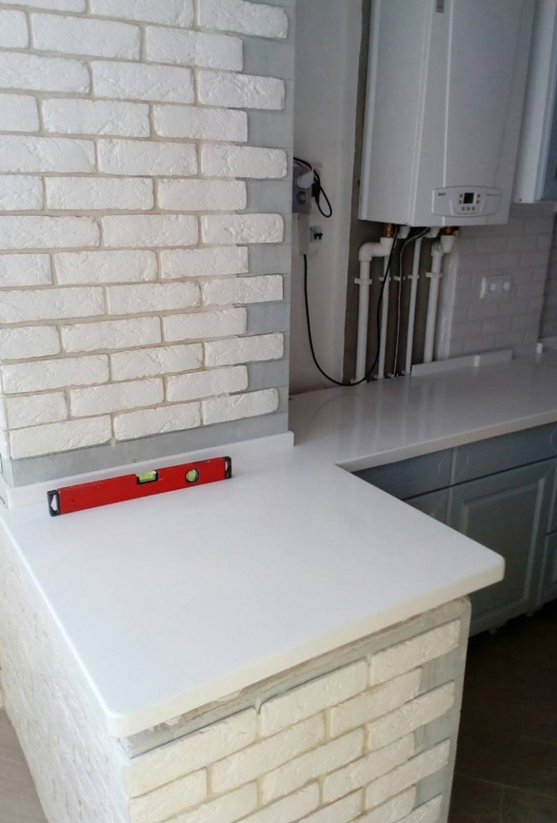 Столешница из акрилового камня DuPoint Basic 101 Pure. Цвет: белый. Заранее сделан вырез под варочную панель с усилением и термозащитой, а также вырез с усилением по мойку.