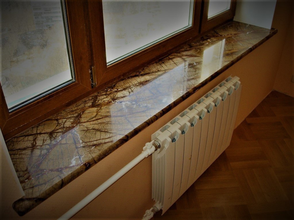 Для изготовления подоконников берутся разные материалы. Все зависит от требуемых характеристик, а также стилистики помещения. Один из популярных – это натуральный камень, такой как мрамор, гранит. Также используется искусственный камень.