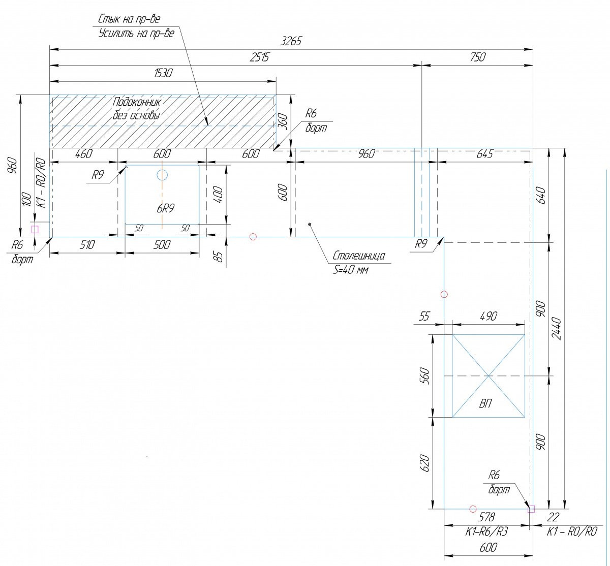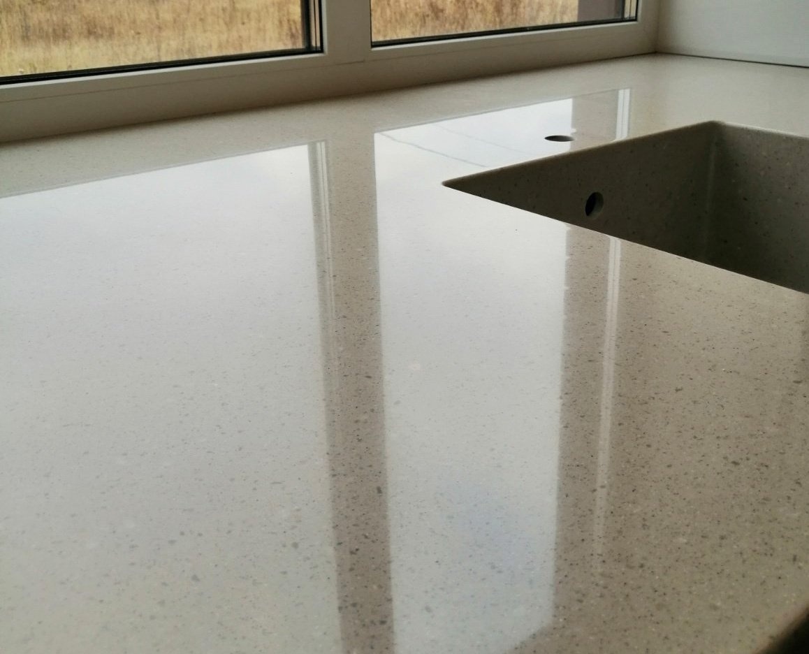 Мы использовали искусственный камень Hi-Macs G137. Цвет: бежевый с вкраплениями. При совмещении столешницы и подоконника, соединение усилили планкой.