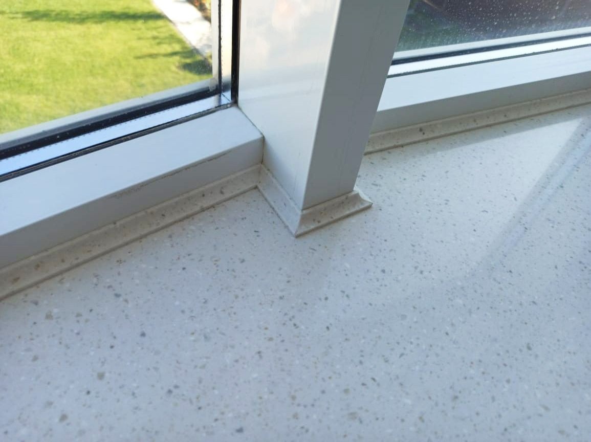 Камень для изделия выбрали Hi-Macs SO34, G135. Цвет: бежевый с вкраплениями. Чтобы округлить подоконник, мы проделали радиусную отделку торцов. А также изготовили накладные бортики Н = 40 мм.