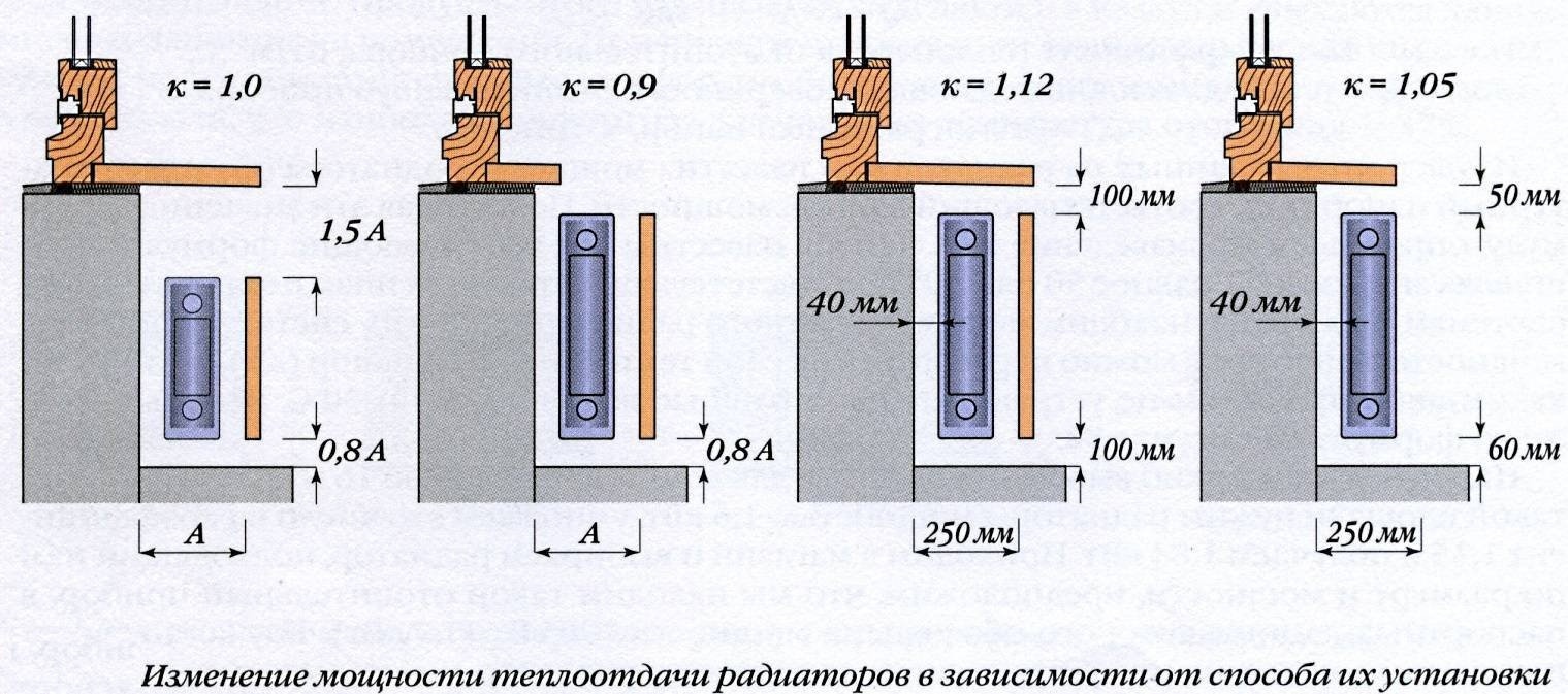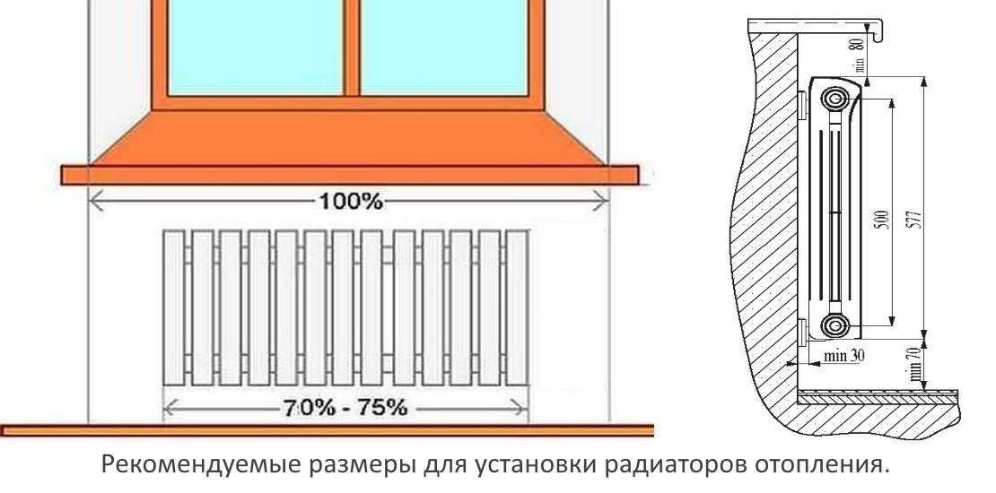 При большом количестве секций или ширине требуется большее расстояние от подоконника, чтобы обеспечить нормальную циркуляцию воздуха.