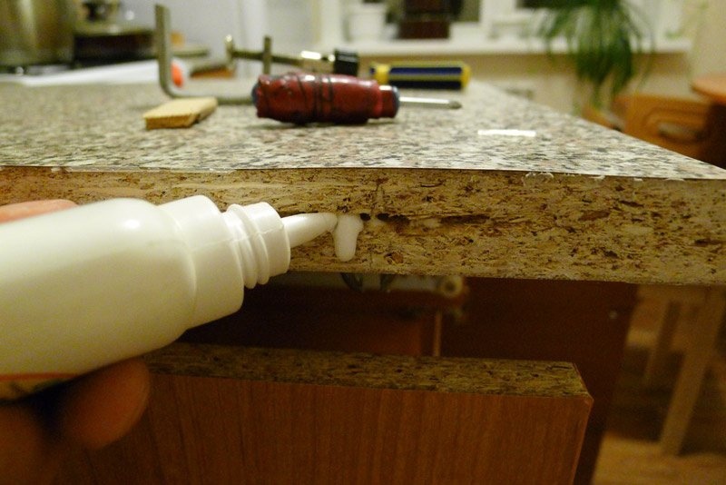 После этого в полость, образовавшуюся внутри, закладываем мебельный клей с опилками или даже с остатками от предыдущего шага. Теперь важно наилучшим образом прижать склеиваемые слои с размокшей стороны. Оставляем столешницу под нагрузкой на сутки.