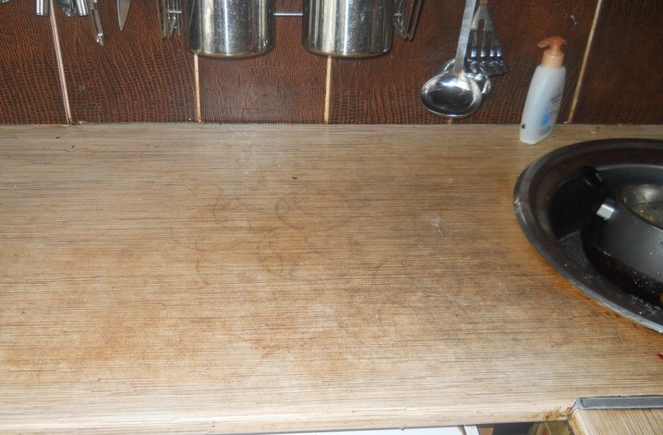 Появление недостатков в виде прожогов связано с контактом слишком горячей посуды с поверхностью. Перед восстановлением столешницы из ЛДСП на кухне необходимо устранить видимые следы прожога. Работайте с наждачной бумагой или напильником при необходимости.
