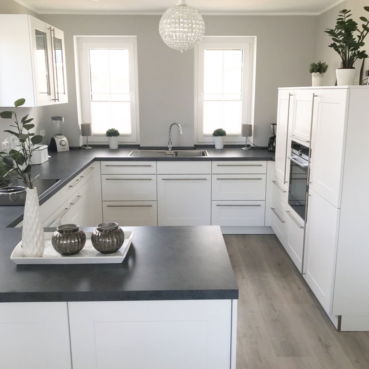 Одно из преимуществ белой кухни с темно-серой столешницей заключается в том, что она легко сочетается с различными стилями декора. Благодаря своей нейтральной основе, такую кухню можно сочетать с любыми цветами, что делает ее универсальной, а также подходящей для всех дизайнов.