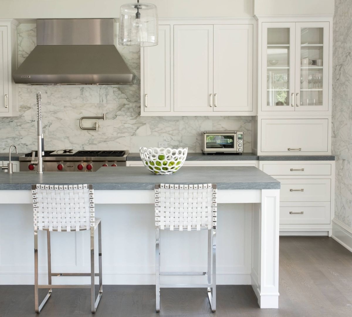 Столешница в интерьере кухни белого цвета вписывается в разные стили. От выполнения в минималистическом стиле до классической элегантности – она легко адаптируется, придавая помещению шарм. Белый и серый цвета в сочетании с другими элементами интерьера, такими как подвесные светильники, плитка или декоративные элементы, создают привлекательный образ, подчеркивающий стиль.