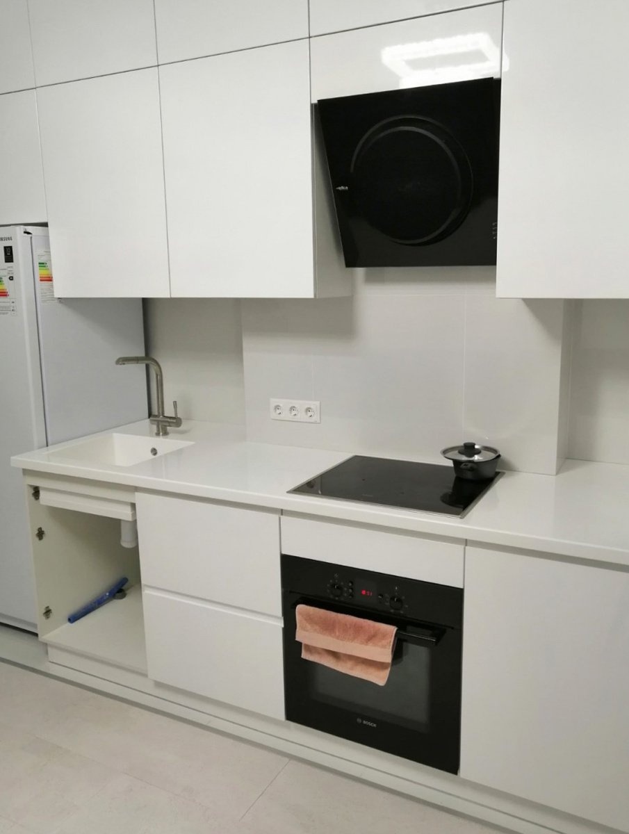 Столешницу мы создавали для готового кухонного гарнитура в современном стиле. Такой интерьер достаточно минималистичный и строгий, его легко сочетать с другими деталями кухни.