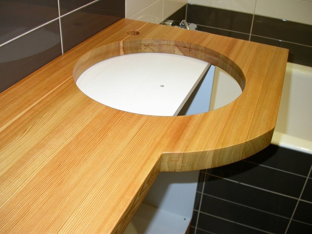 Для изготовления стола можно взять дуб, тик или сосну. Они придадут ванной комнате уют. Помещение будет выглядеть не только красиво, но и богато.